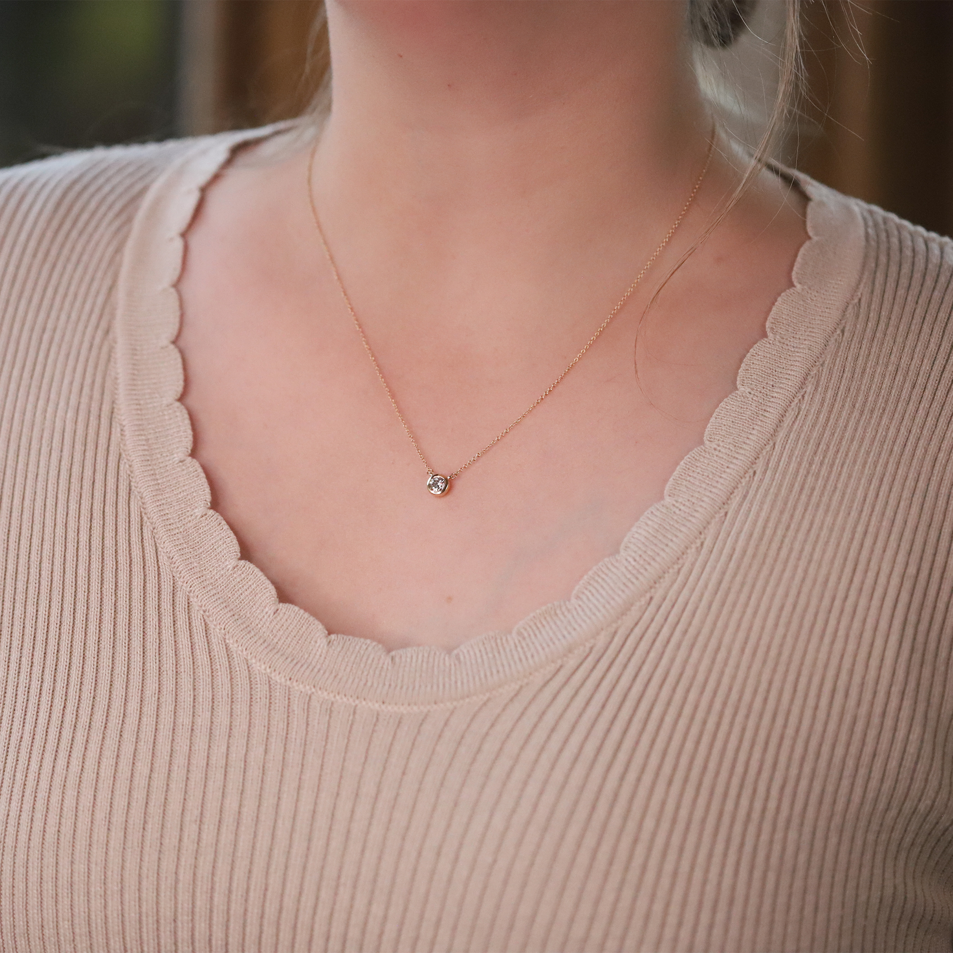 A classic solitiare necklace featuring a securely set lab grown diamond. This diamond set in 14k rose gold is perfect for creating a subtle sparkle. Read More Read Less