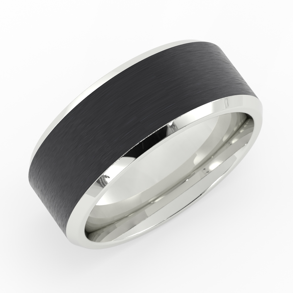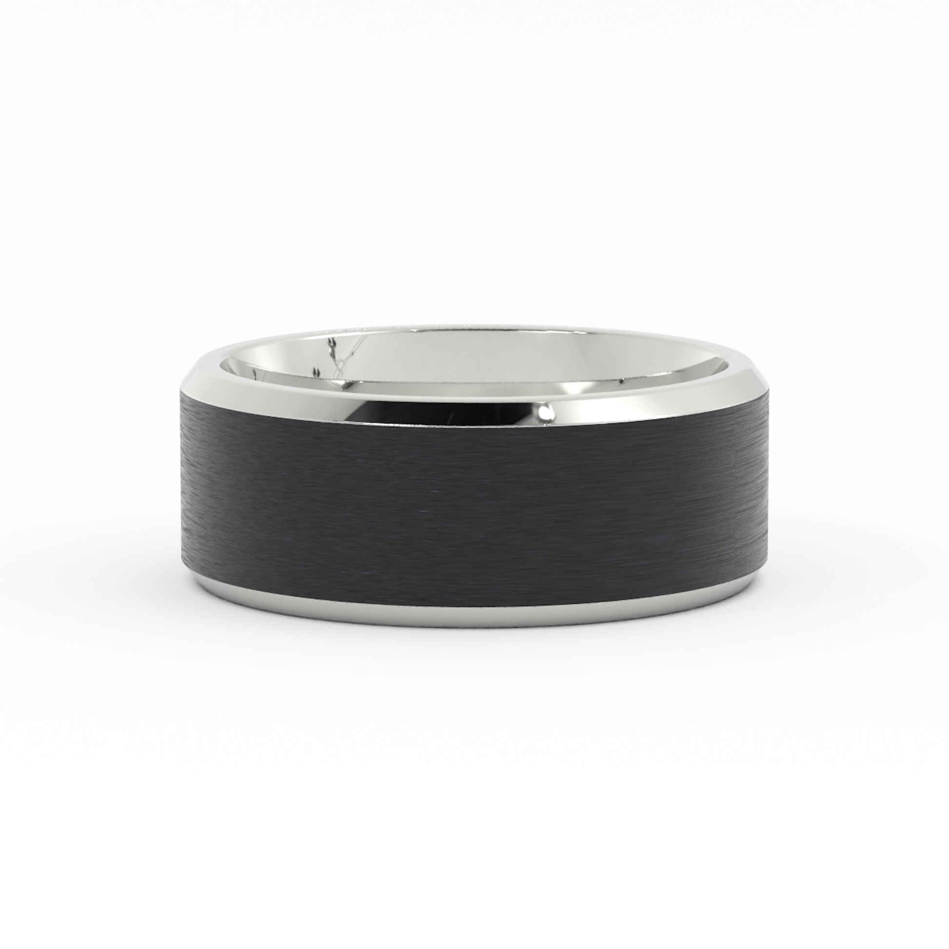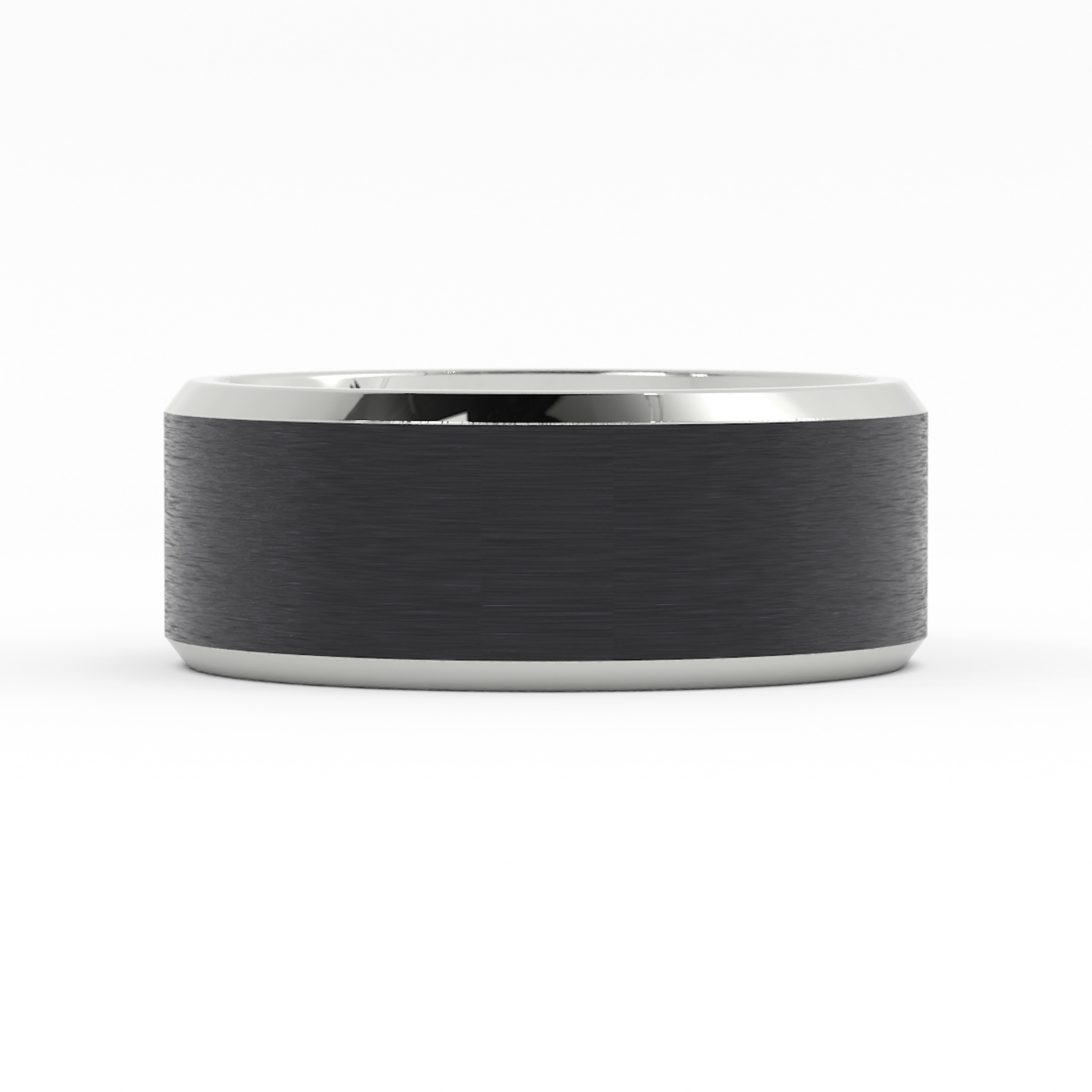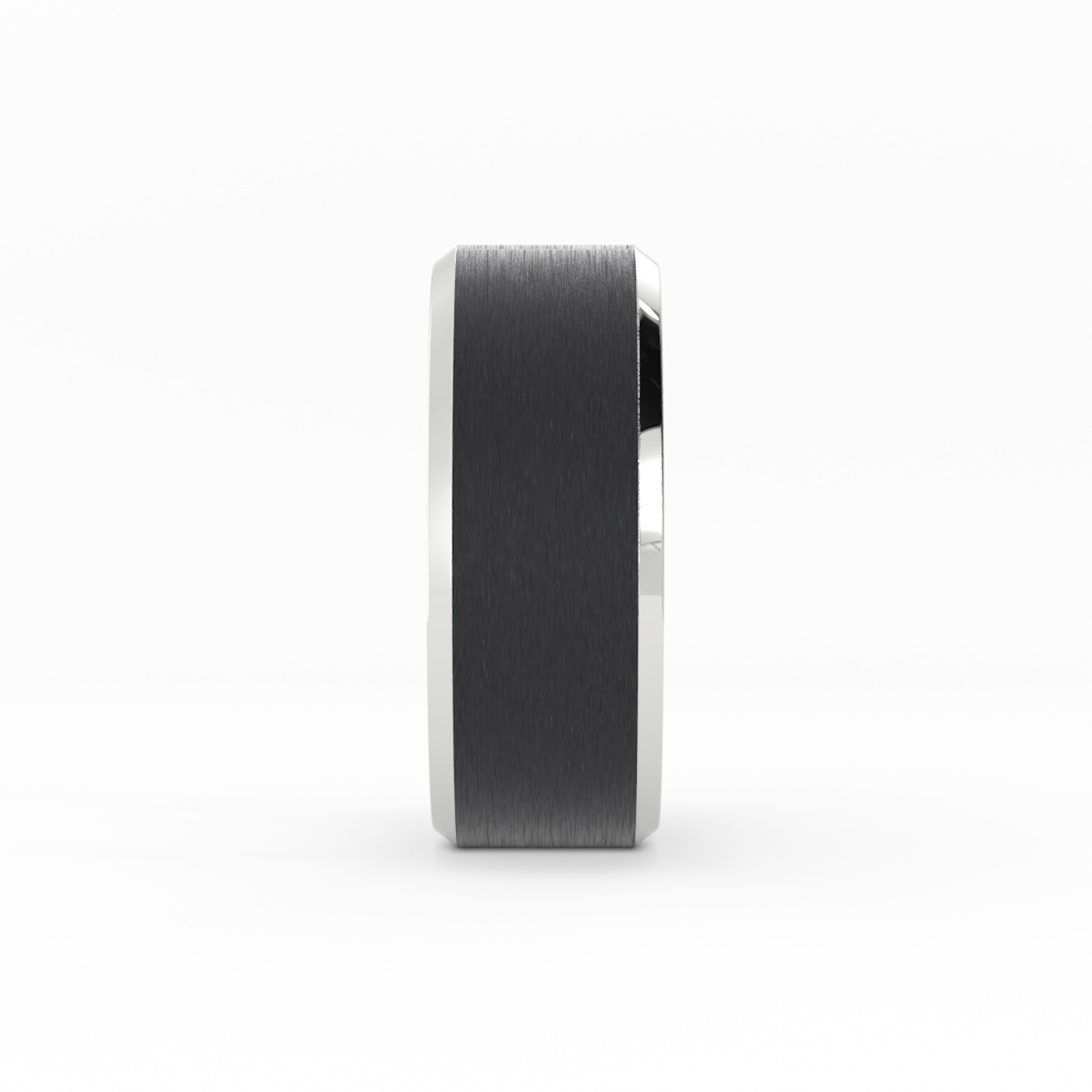 This flat black tungsten band features a refined satin finish, accented by sleek white edges with a polished shine. The interplay of black and silver creates a bold yet timelessly elegant design.