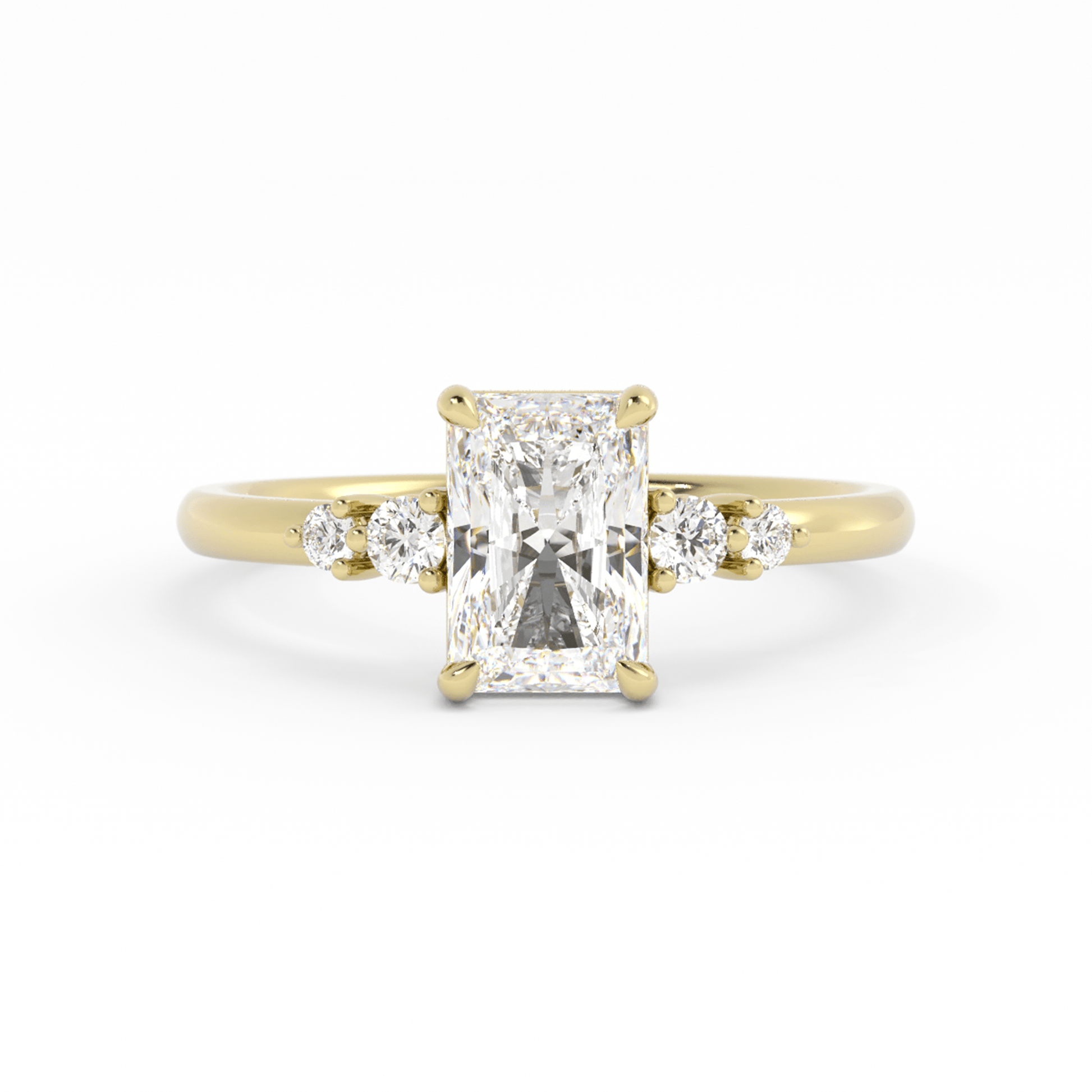 Delicate and radiant, this engagement ring features a brilliant radiant-cut center stone set with four claw prongs, elegantly framed in a classic basket setting. On each side, two small graduating round stones add a soft touch of sparkle and balance, all set along a dainty shank for a refined, timeless look with graceful detail.