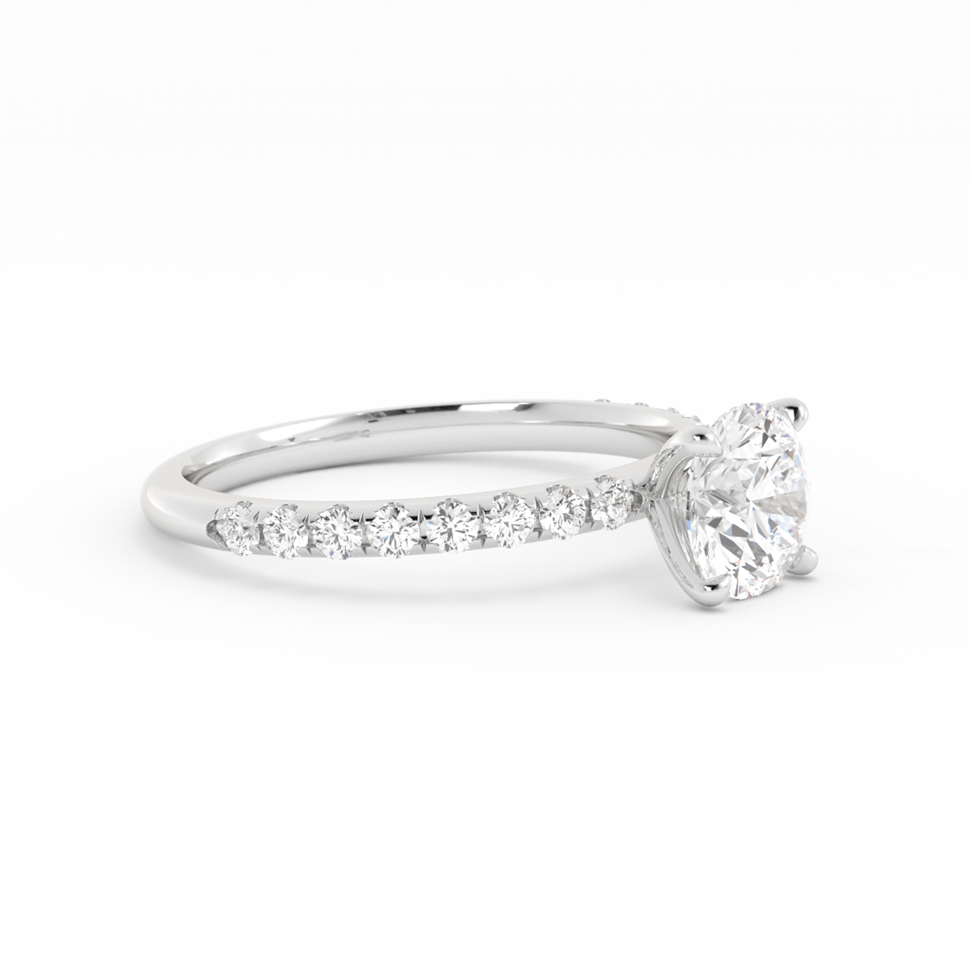 Elegant and refined, this engagement ring features a round center stone set with four claw prongs, complemented by a dainty band adorned with pavé-set stones halfway down the shank—offering delicate sparkle in a timeless, stackable design.