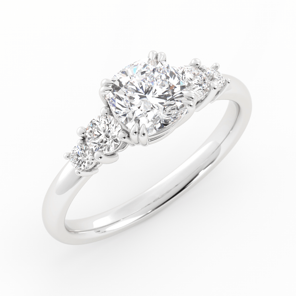 Elegant and timeless, this engagement ring features a cushion-cut center stone secured by four double claw prongs, highlighting its soft, square silhouette. On each side, two graduating round accent stones are set in a graceful basket setting, adding balanced sparkle and a sense of gentle flow. Finished with a refined band, this design offers a classic look with thoughtful detail and enduring beauty.