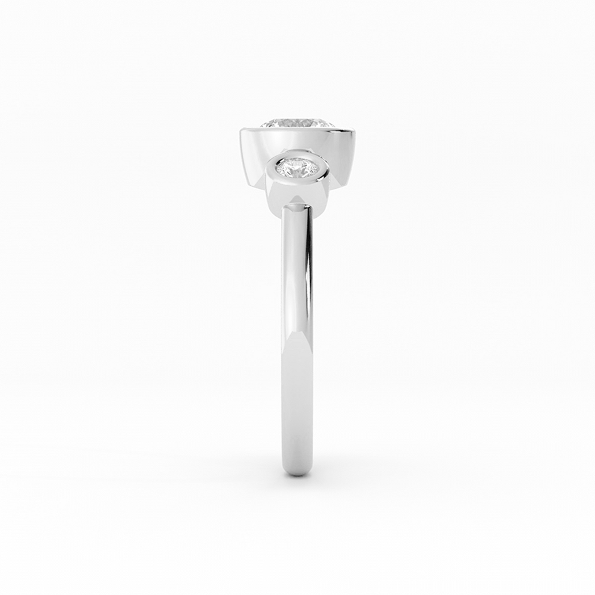 Discover the epitome of modern elegance with the Alexandra Three-Stone Lab-Grown Diamond Engagement Ring, a standout piece in the Olympia Collection. This striking ring features three dazzling lab-grown diamonds, each bezel set to perfection. The center diamond commands attention with its brilliance, while two smaller side stones add a harmonious balance, symbolizing the past, present, and future of your love story.