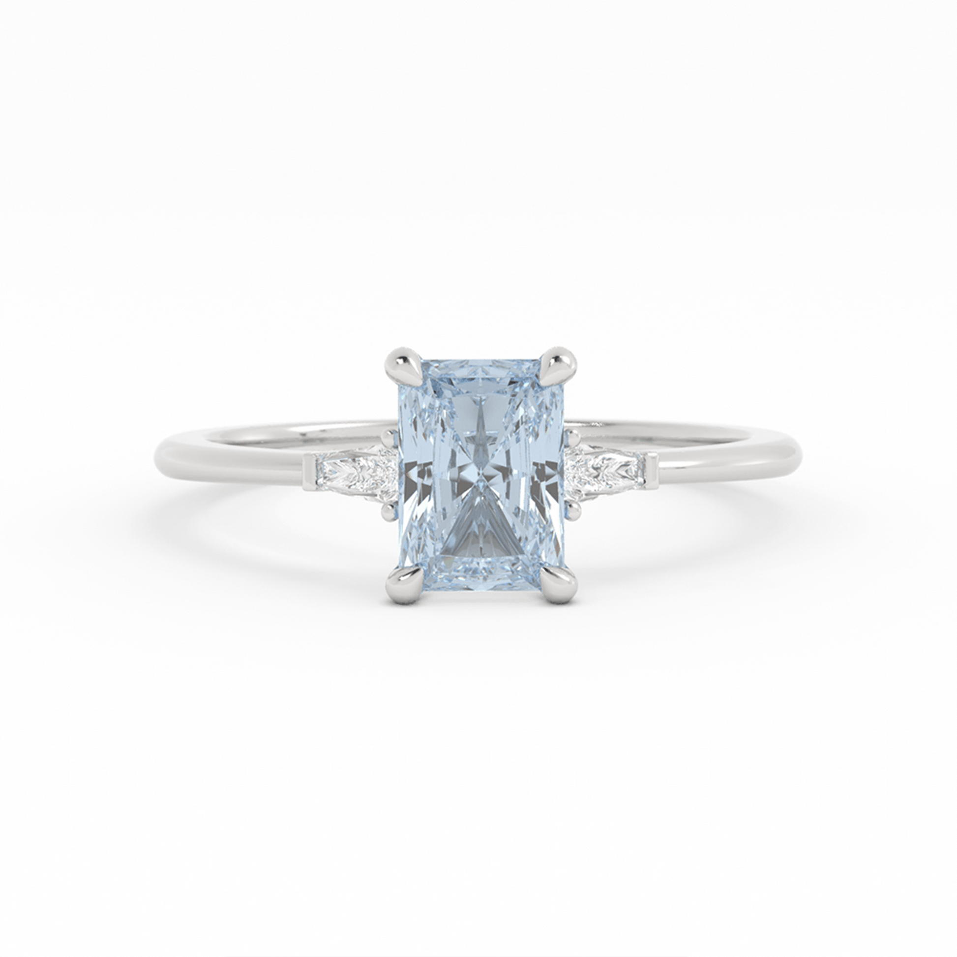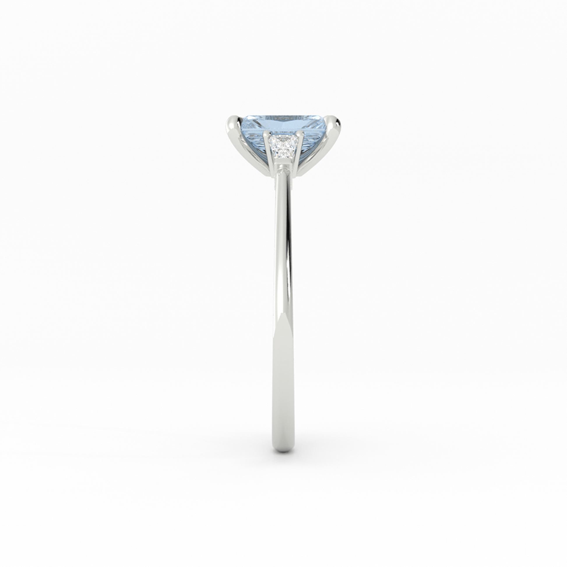 Timeless sophistication meets modern elegance in the Amelia Emerald-Cut Aquamarine and Tapered Baguette Lab-Grown Diamond Engagement Ring, a stunning design from the Olympia Collection. At its center, a captivating emerald-cut aquamarine exudes serene beauty with its mesmerizing blue hue, securely set with four claw prongs to enhance its brilliance and classic silhouette. Flanking the center stone, two tapered baguette lab-grown diamonds are set with sleek bar settings, adding a refined and graceful touch to this three-stone masterpiece.