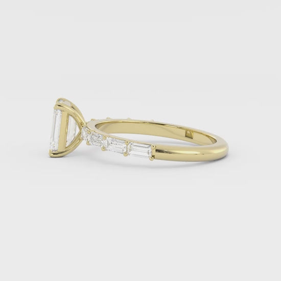 Sleek and sophisticated, this engagement ring features an emerald-cut center stone set with four claw prongs, showcasing its clean lines and timeless elegance. Straight baguette accent stones extend halfway down the shank, adding refined sparkle and a structured, modern feel—finished with a slim, stackable band for effortless pairing.