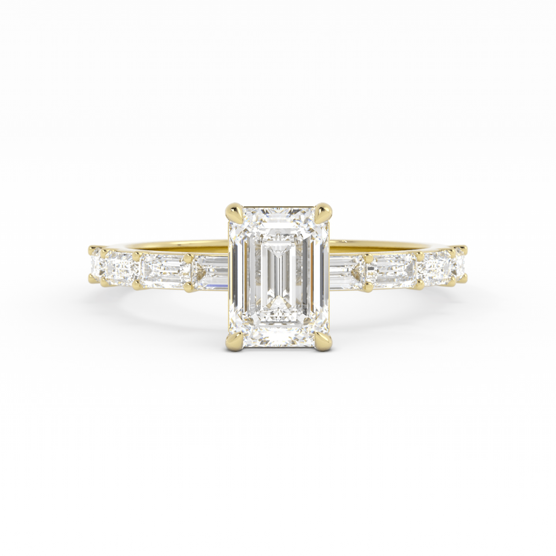 Sleek and sophisticated, this engagement ring features an emerald-cut center stone set with four claw prongs, showcasing its clean lines and timeless elegance. Straight baguette accent stones extend halfway down the shank, adding refined sparkle and a structured, modern feel—finished with a slim, stackable band for effortless pairing.