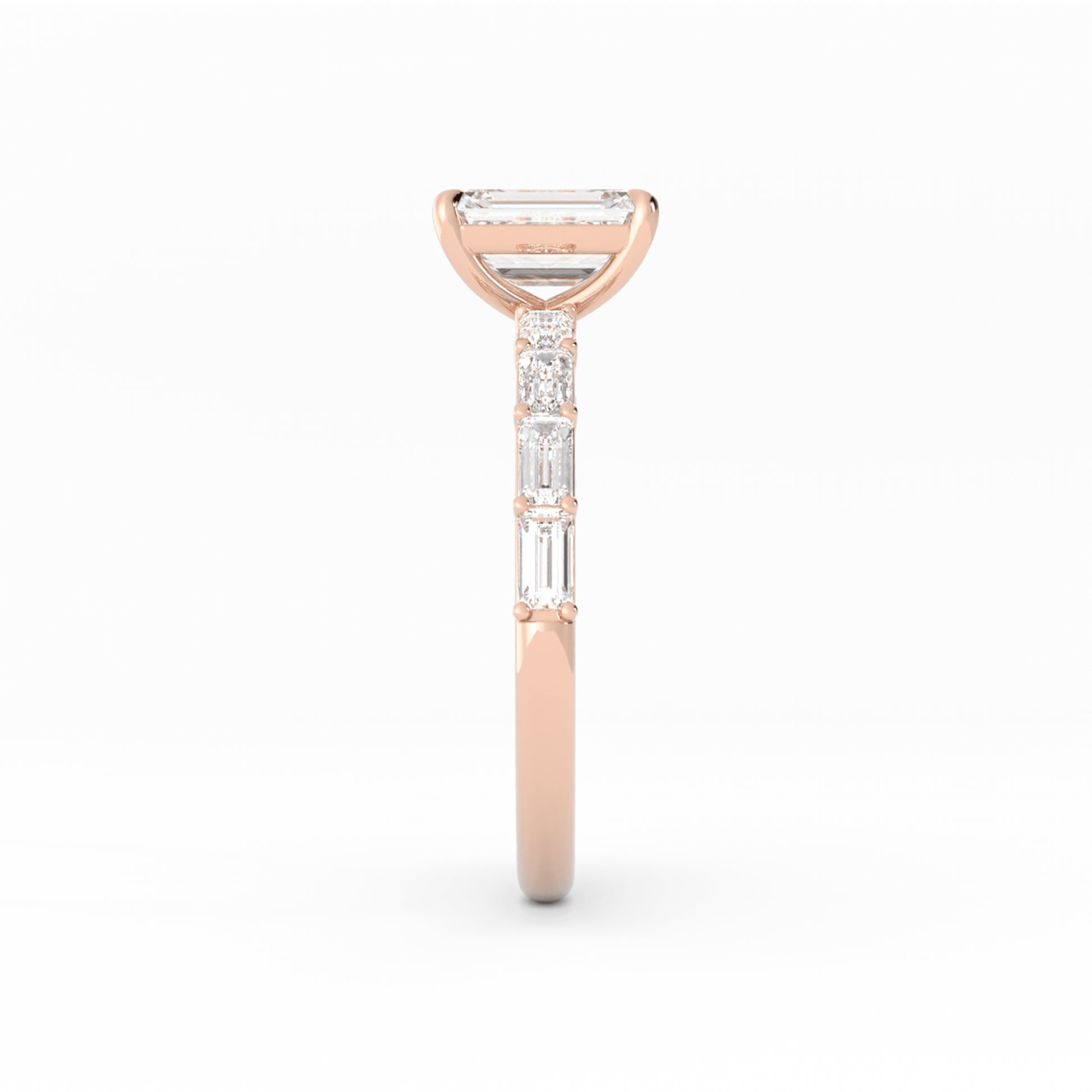 Sleek and sophisticated, this engagement ring features an emerald-cut center stone set with four claw prongs, showcasing its clean lines and timeless elegance. Straight baguette accent stones extend halfway down the shank, adding refined sparkle and a structured, modern feel—finished with a slim, stackable band for effortless pairing.