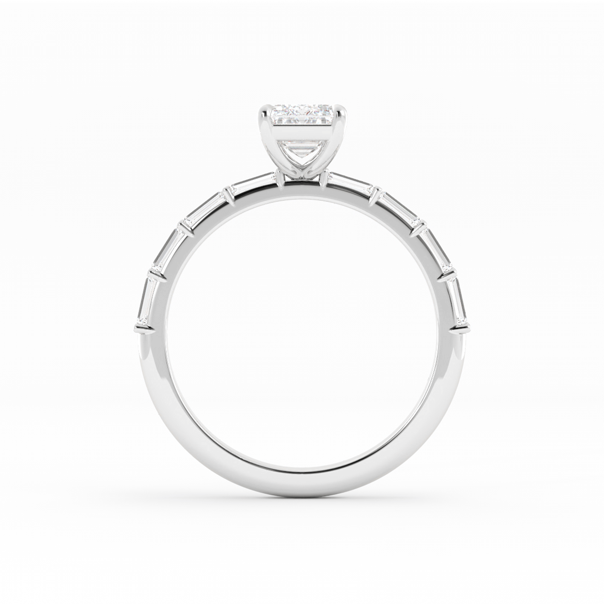 Sleek and sophisticated, this engagement ring features an emerald-cut center stone set with four claw prongs, showcasing its clean lines and timeless elegance. Straight baguette accent stones extend halfway down the shank, adding refined sparkle and a structured, modern feel—finished with a slim, stackable band for effortless pairing.