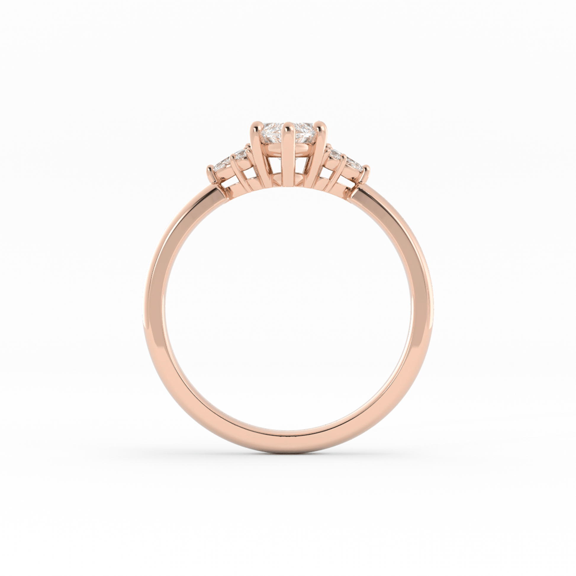 Striking and elegant, this engagement ring features a marquise center stone secured with six claw prongs, set in a graceful basket setting. On each side, three accent stones—two round and one marquise—add balance and brilliance, creating a refined design that blends classic form with modern detail.