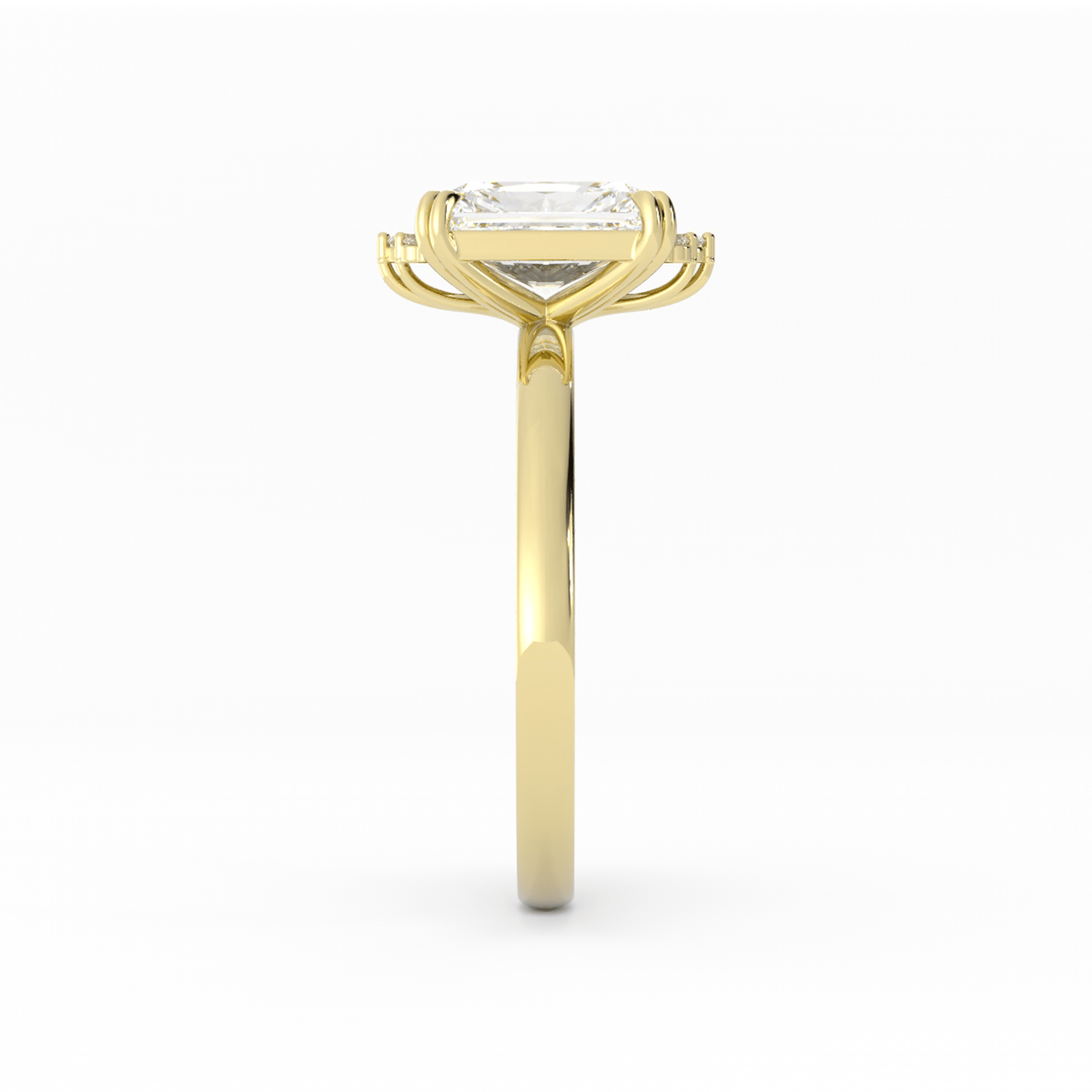 Bold and refined, this engagement ring features a radiant-cut center stone set with four double claw prongs, offering a striking silhouette. A half halo of accent stones graces the north and south sides of the center, adding brilliance and dimension—perfectly complemented by a slim band that’s designed to stack beautifully.