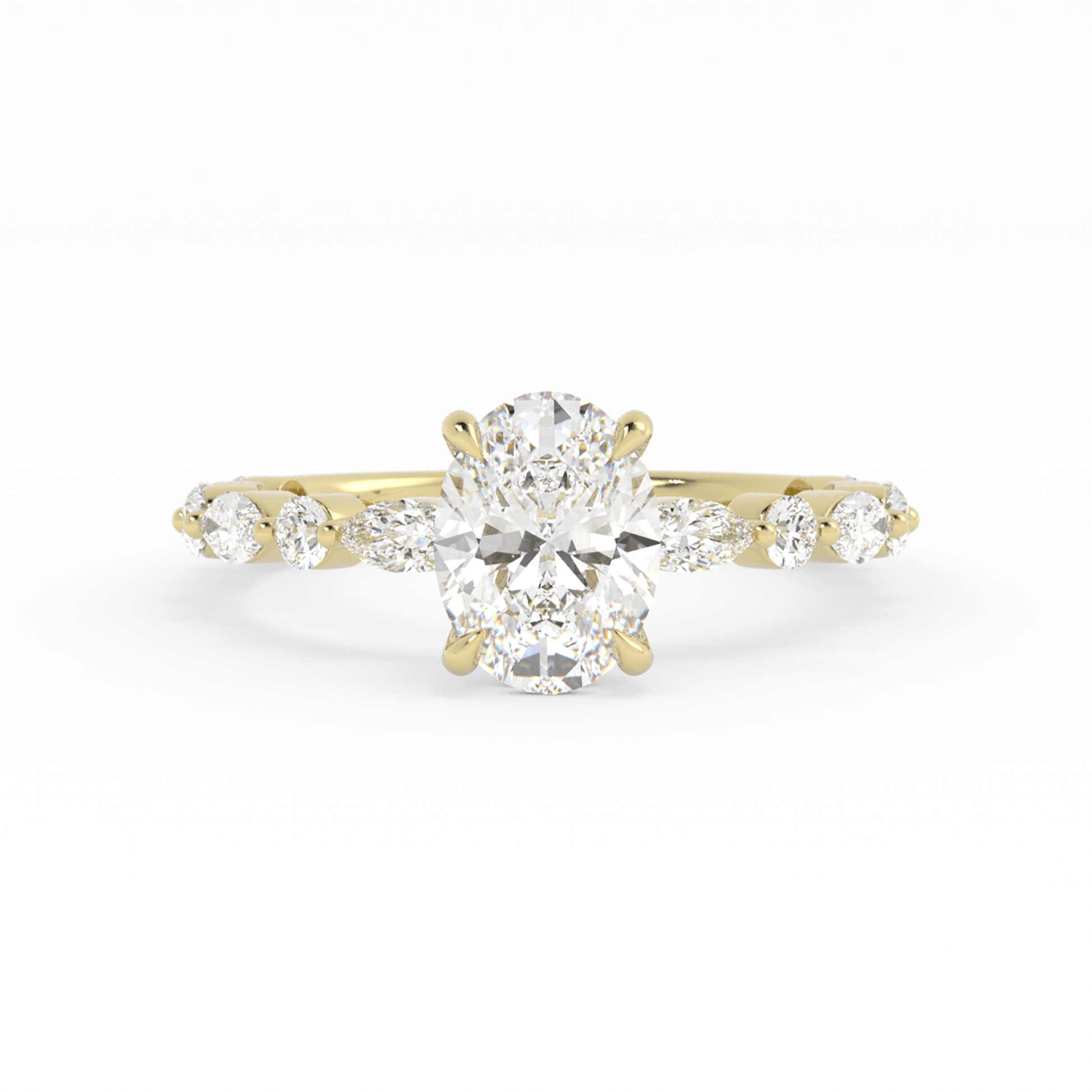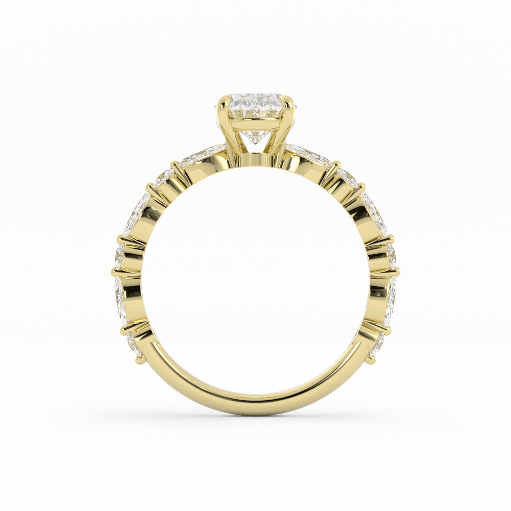 Graceful and eye-catching, this engagement ring features an oval center stone set with four claw prongs, complemented by a band adorned with alternating marquise and round stones that extend 2/3 down the shank—offering a romantic blend of sparkle, shape, and timeless elegance.