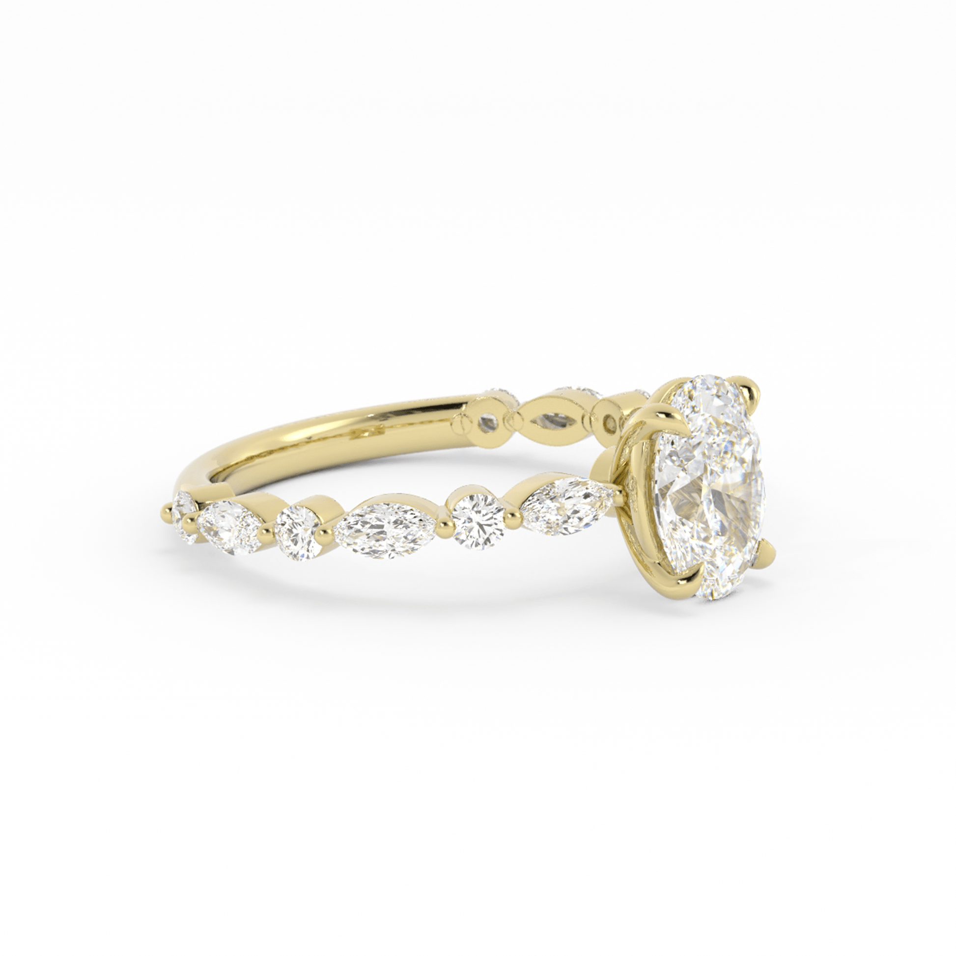 Graceful and eye-catching, this engagement ring features an oval center stone set with four claw prongs, complemented by a band adorned with alternating marquise and round stones that extend 2/3 down the shank—offering a romantic blend of sparkle, shape, and timeless elegance.