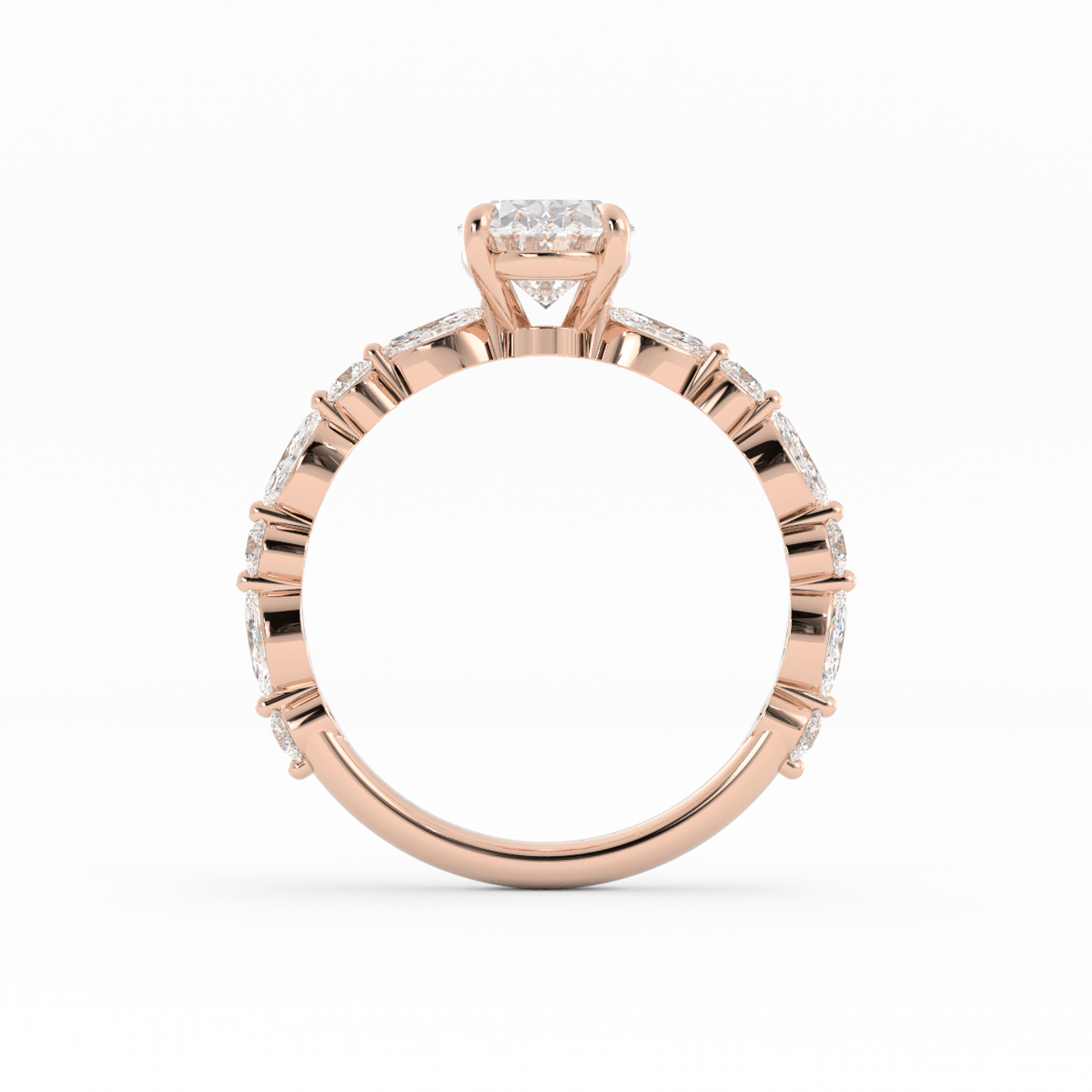 Graceful and eye-catching, this engagement ring features an oval center stone set with four claw prongs, complemented by a band adorned with alternating marquise and round stones that extend 2/3 down the shank—offering a romantic blend of sparkle, shape, and timeless elegance.
