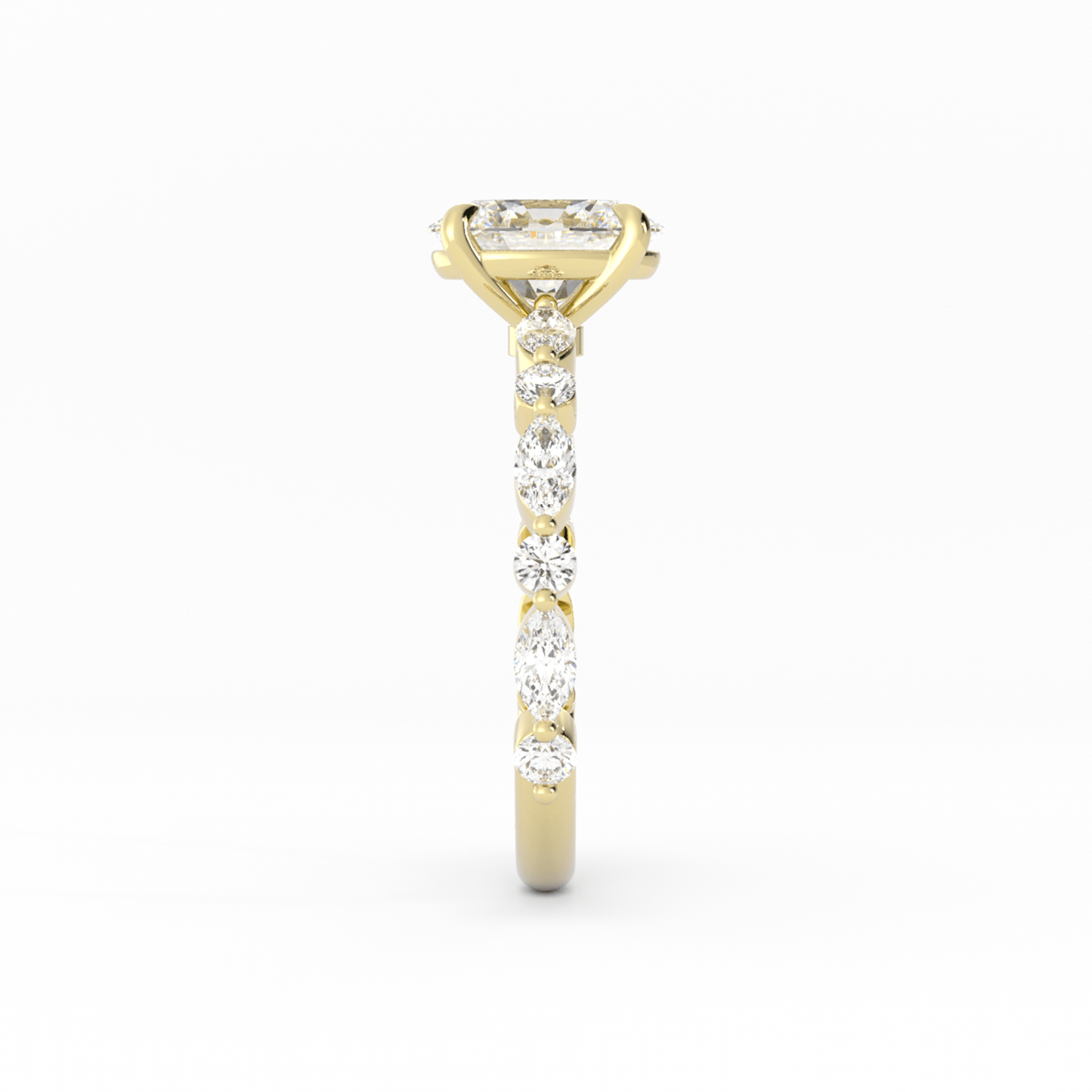 Graceful and eye-catching, this engagement ring features an oval center stone set with four claw prongs, complemented by a band adorned with alternating marquise and round stones that extend 2/3 down the shank—offering a romantic blend of sparkle, shape, and timeless elegance.