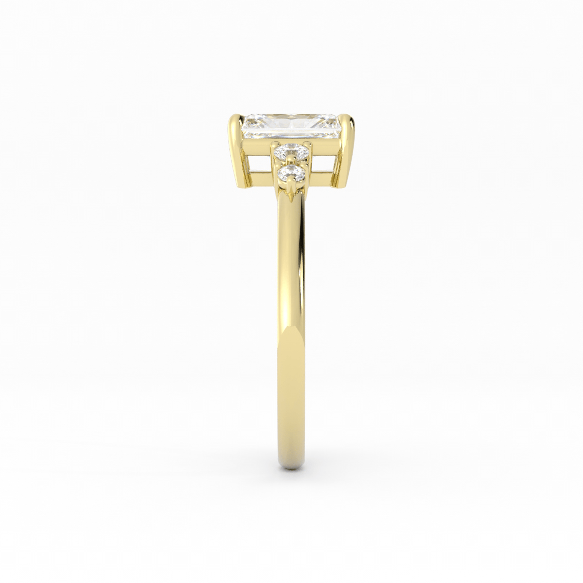 Delicate and radiant, this engagement ring features a brilliant radiant-cut center stone set with four claw prongs, elegantly framed in a classic basket setting. On each side, two small graduating round stones add a soft touch of sparkle and balance, all set along a dainty shank for a refined, timeless look with graceful detail.