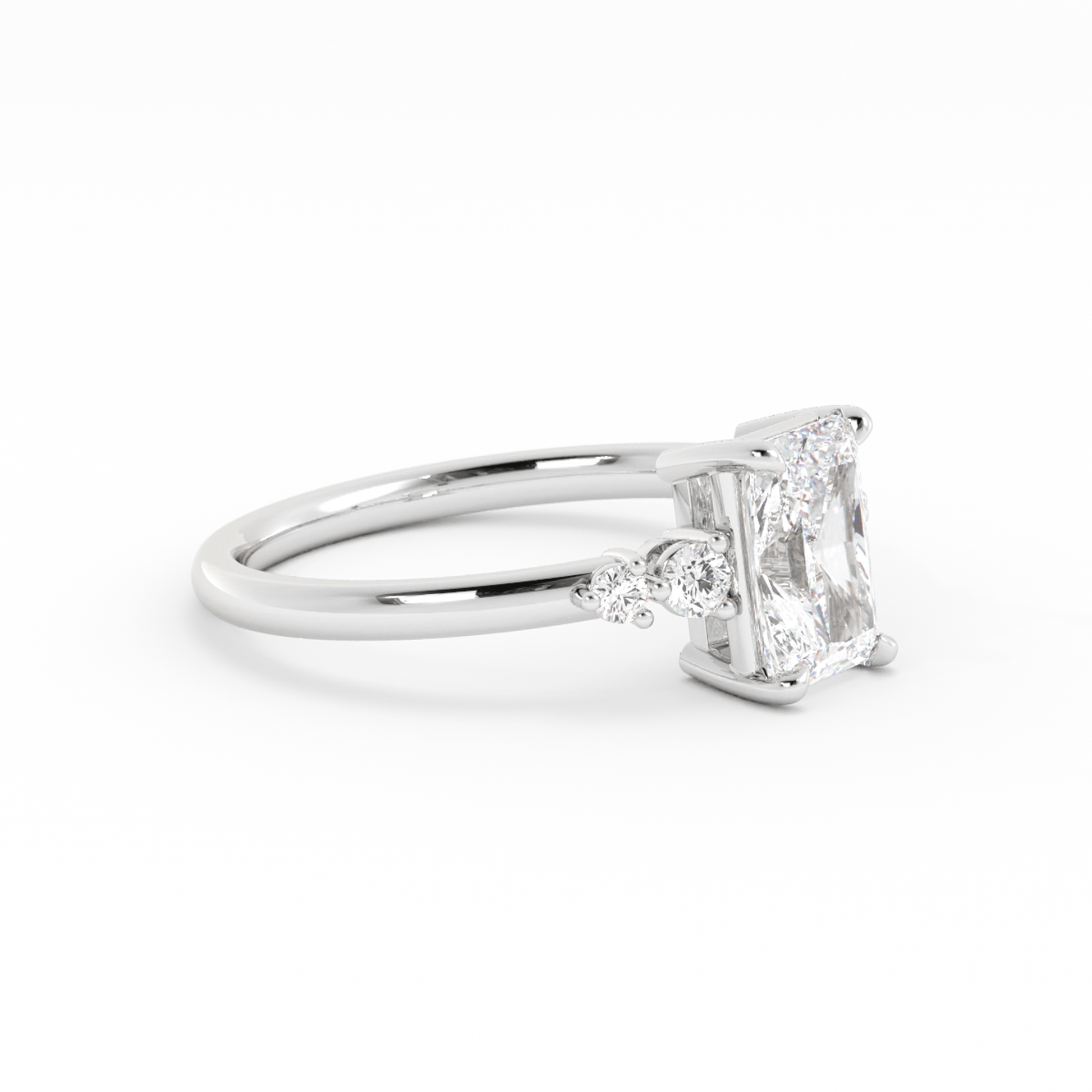 Delicate and radiant, this engagement ring features a brilliant radiant-cut center stone set with four claw prongs, elegantly framed in a classic basket setting. On each side, two small graduating round stones add a soft touch of sparkle and balance, all set along a dainty shank for a refined, timeless look with graceful detail.