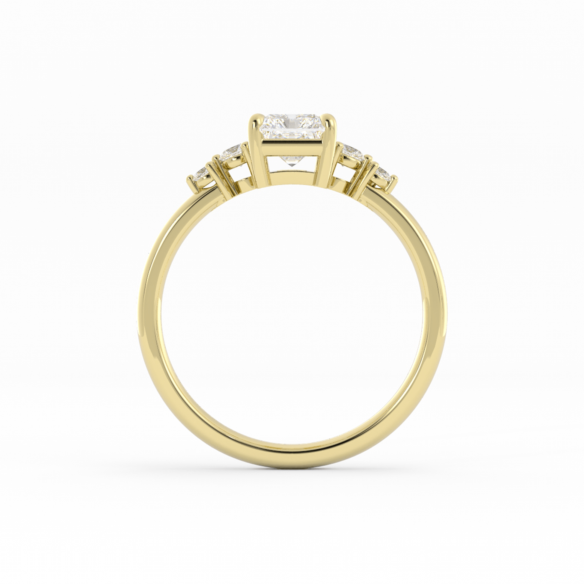 Delicate and radiant, this engagement ring features a brilliant radiant-cut center stone set with four claw prongs, elegantly framed in a classic basket setting. On each side, two small graduating round stones add a soft touch of sparkle and balance, all set along a dainty shank for a refined, timeless look with graceful detail.