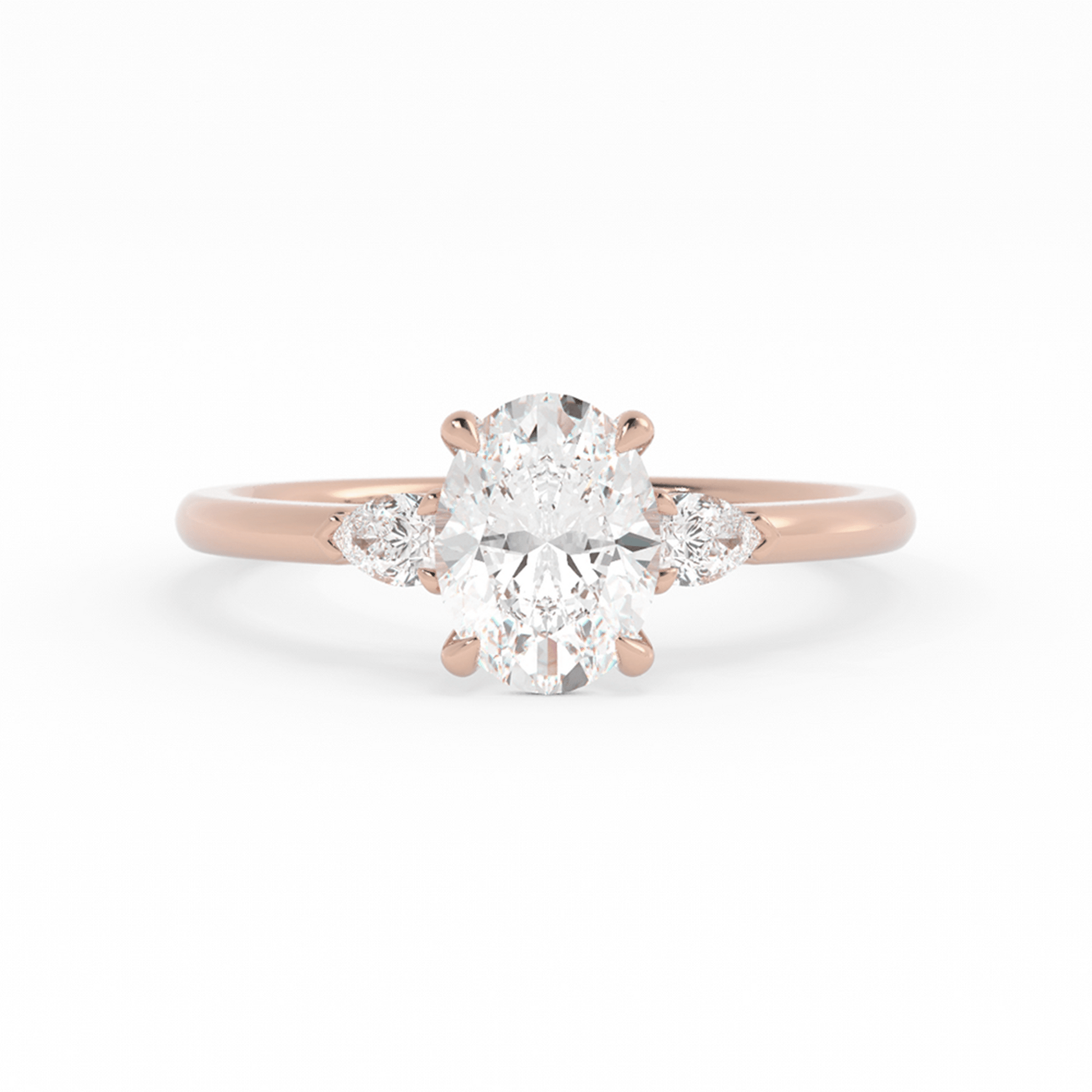 The Clara Oval and Pear Lab-Grown Diamond Engagement Ring from the Olympia Collection exudes timeless sophistication and modern elegance. At its heart, a stunning 1-carat oval lab-grown diamond is set with delicate claw prongs, showcasing its brilliance and elegant silhouette. Flanking the center stone, two pear-shaped lab-grown diamonds are securely set with unique chevron prongs, adding a distinctive and graceful touch to this exquisite design.