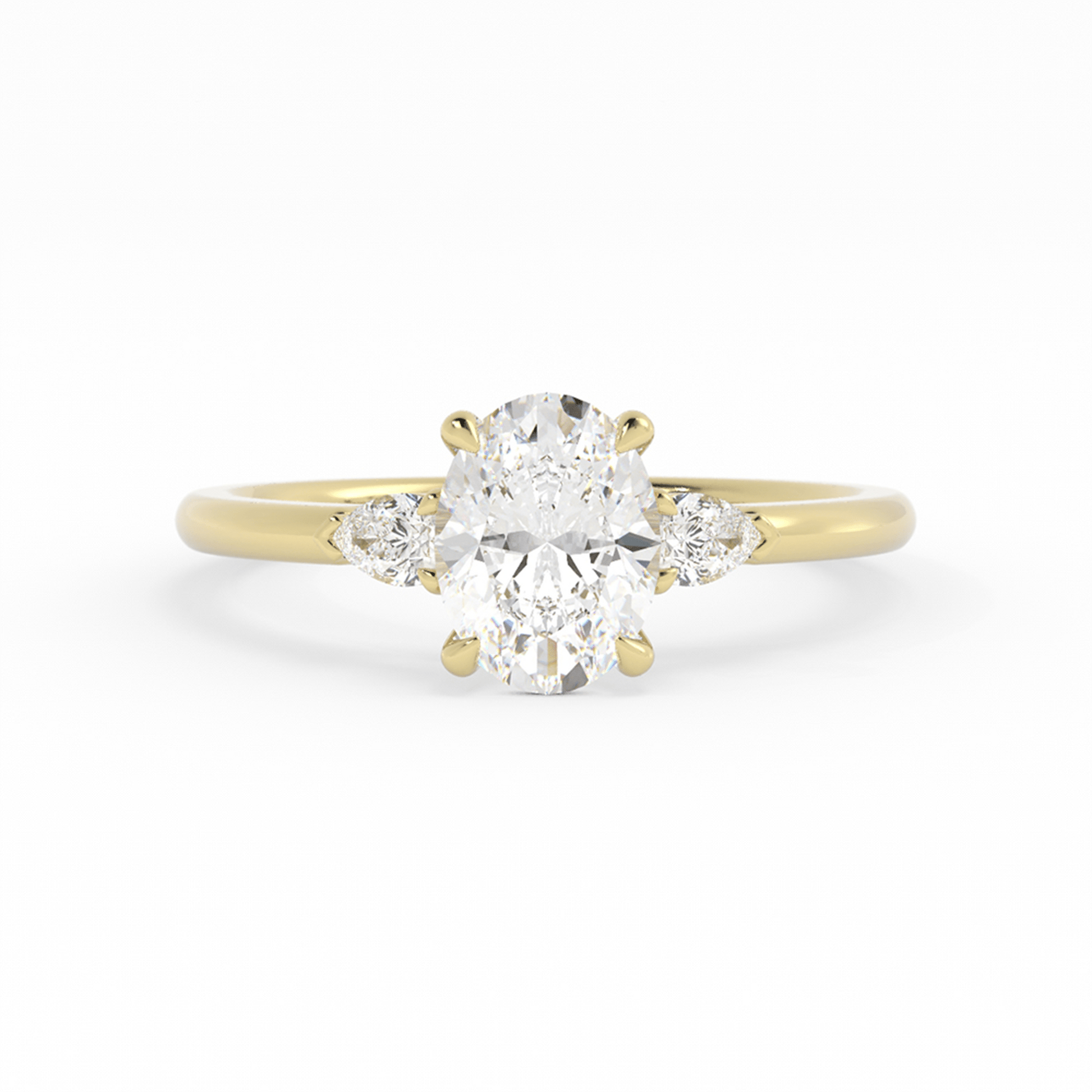The Clara Oval and Pear Lab-Grown Diamond Engagement Ring from the Olympia Collection exudes timeless sophistication and modern elegance. At its heart, a stunning 1-carat oval lab-grown diamond is set with delicate claw prongs, showcasing its brilliance and elegant silhouette. Flanking the center stone, two pear-shaped lab-grown diamonds are securely set with unique chevron prongs, adding a distinctive and graceful touch to this exquisite design.