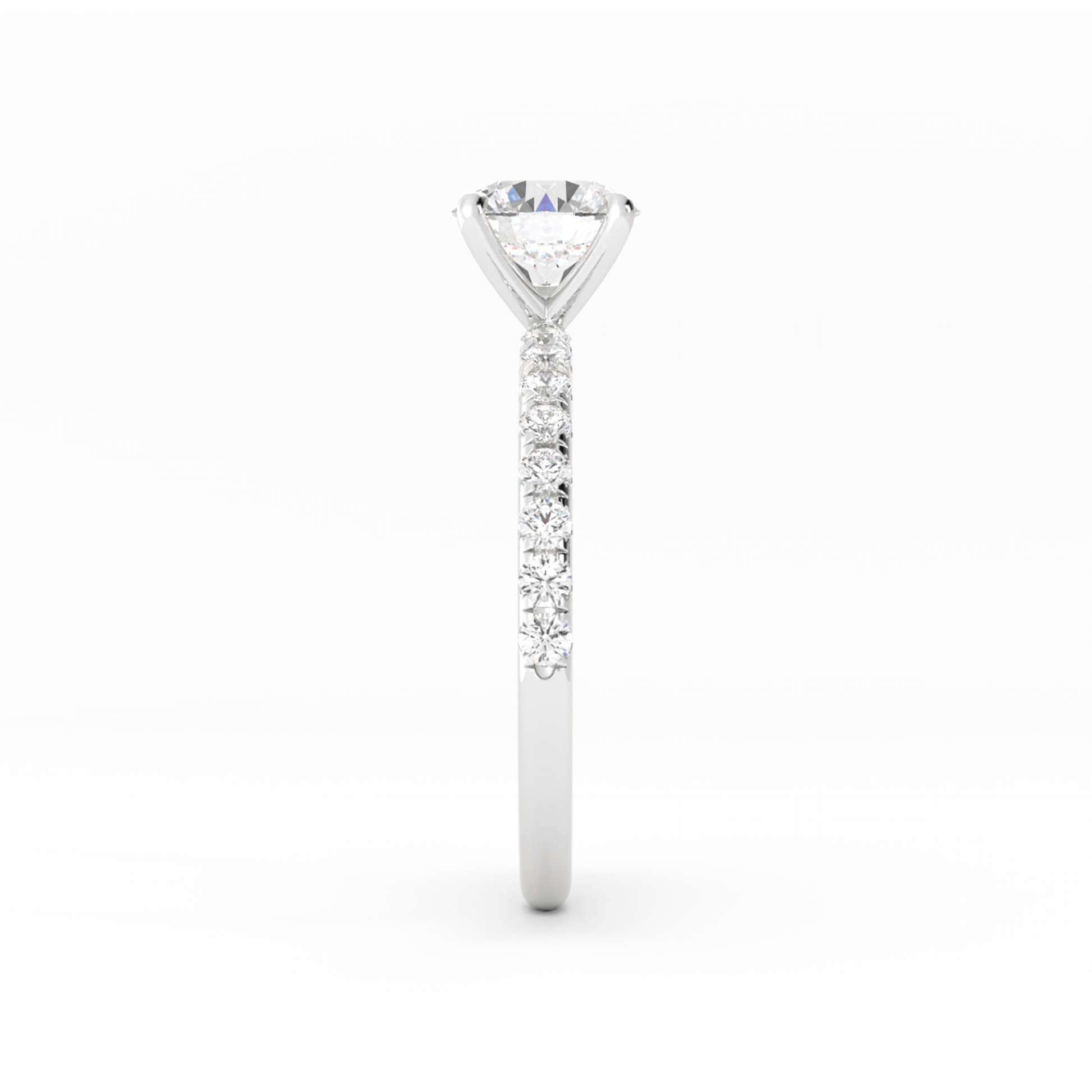 Elegant and refined, this engagement ring features a round center stone set with four claw prongs, complemented by a dainty band adorned with pavé-set stones halfway down the shank—offering delicate sparkle in a timeless, stackable design.