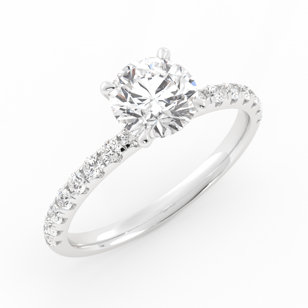 Elegant and refined, this engagement ring features a round center stone set with four claw prongs, complemented by a dainty band adorned with pavé-set stones halfway down the shank—offering delicate sparkle in a timeless, stackable design.