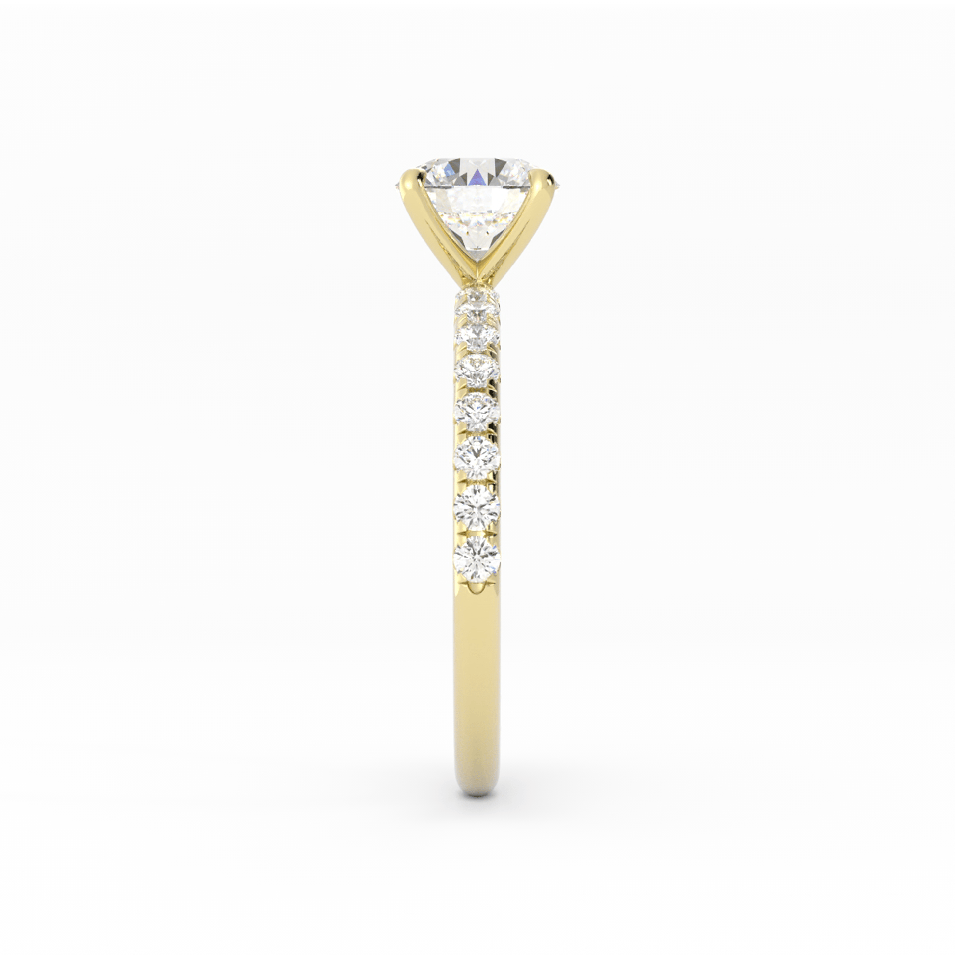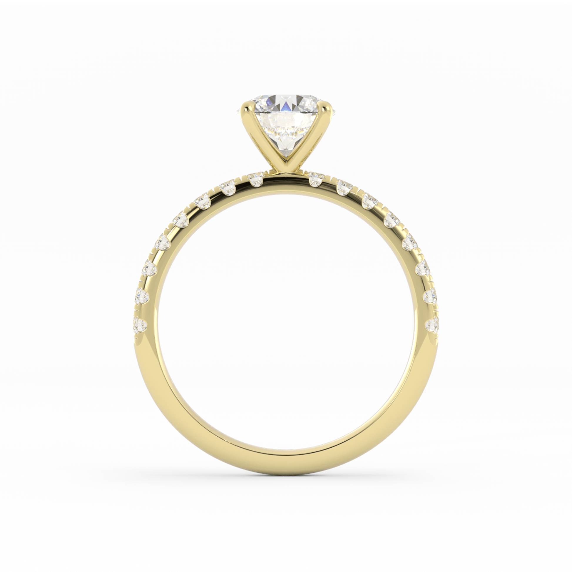 Elegant and refined, this engagement ring features a round center stone set with four claw prongs, complemented by a dainty band adorned with pavé-set stones halfway down the shank—offering delicate sparkle in a timeless, stackable design.