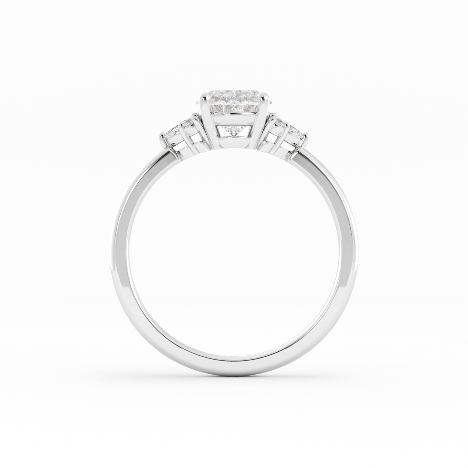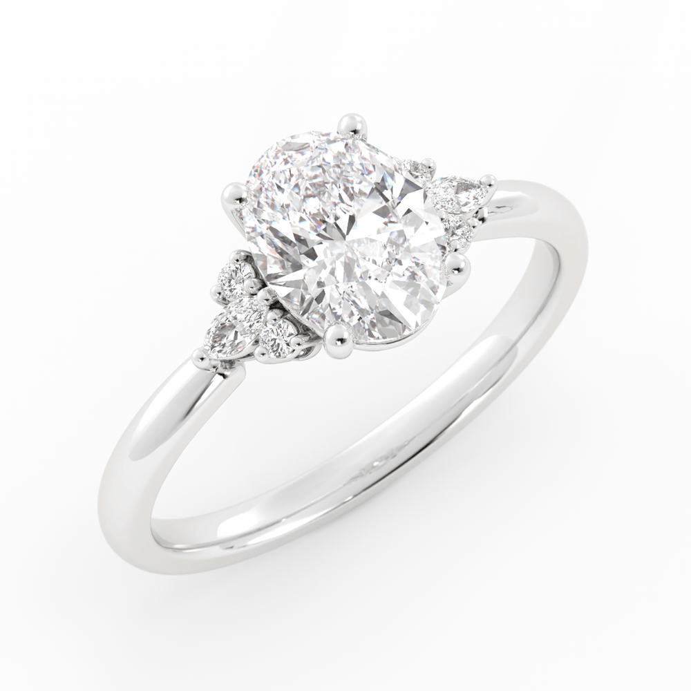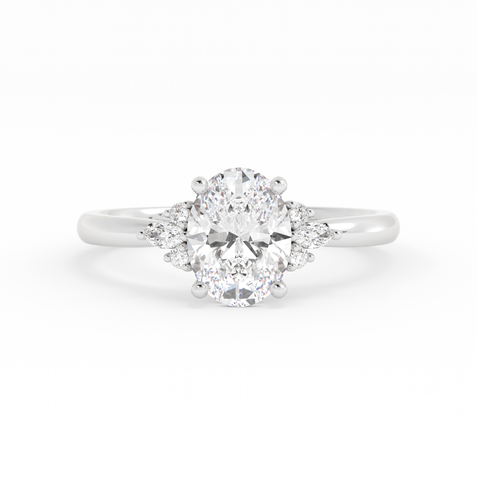 Romantic and refined, this engagement ring features an oval center stone set with four round prongs and nestled in a graceful basket setting. On each side, three accent stones—two round and one marquise—add a balanced touch of sparkle and elegance, creating a timeless design with delicate dimension.