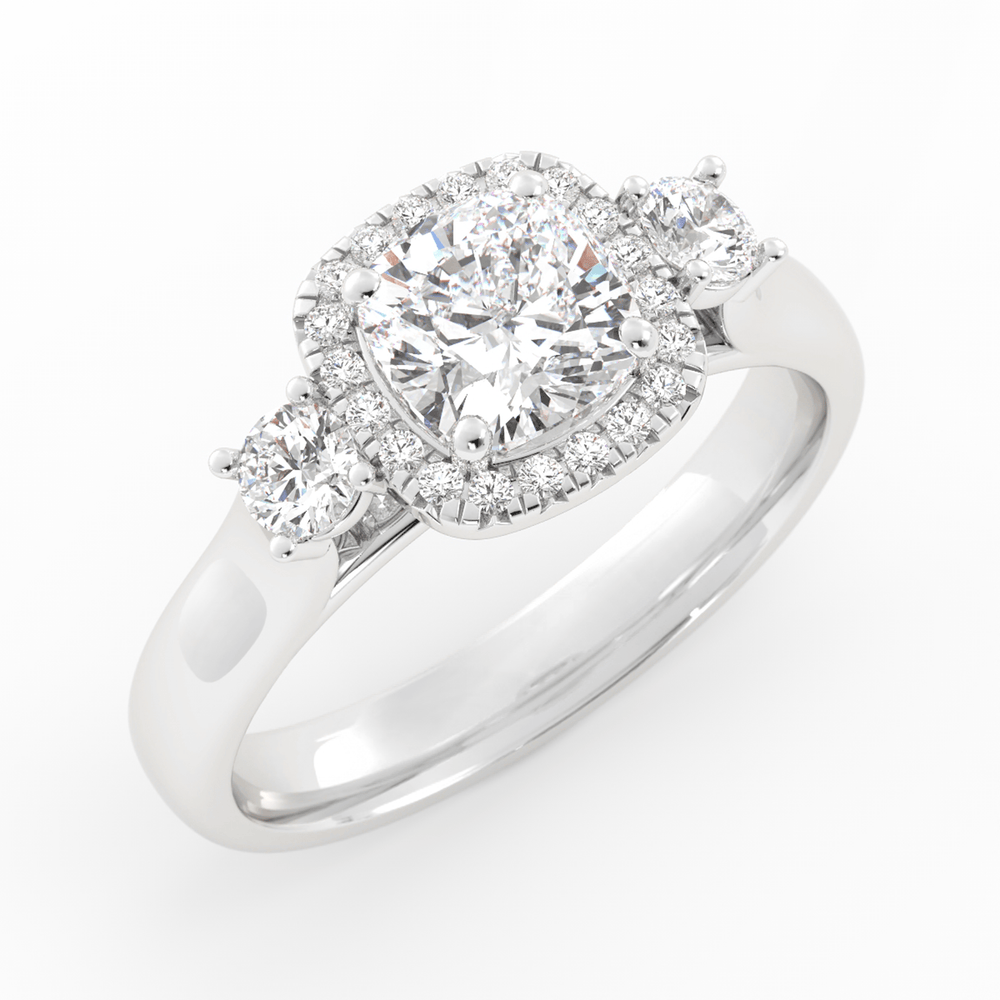 Bold yet timeless, this engagement ring features a cushion-cut center stone encircled by a sparkling halo, adding brilliance and depth. A single accent stone on each side of the shank enhances the design, while the chunky band offers a modern edge and remains perfectly stackable for a striking, layered look.