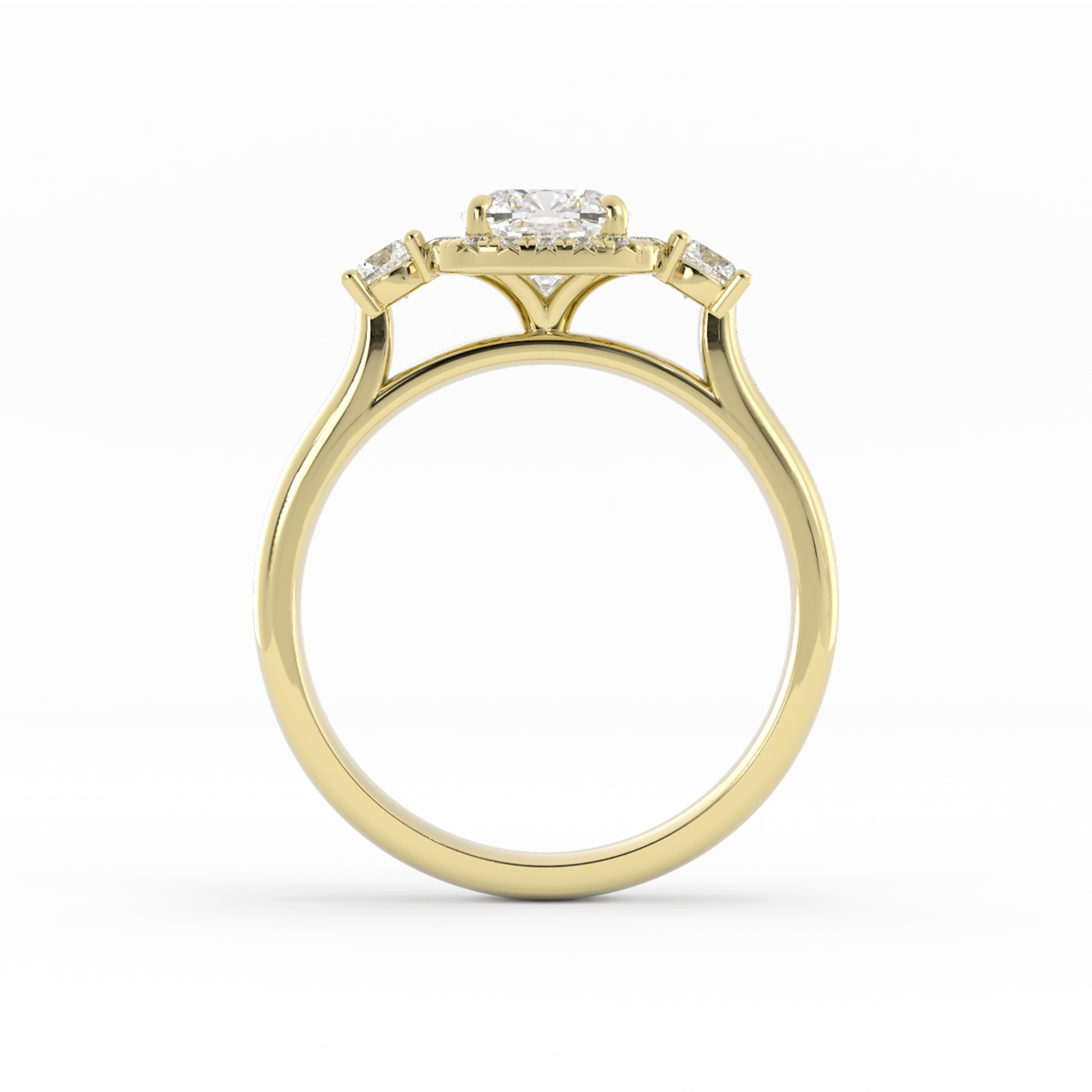 Bold yet timeless, this engagement ring features a cushion-cut center stone encircled by a sparkling halo, adding brilliance and depth. A single accent stone on each side of the shank enhances the design, while the chunky band offers a modern edge and remains perfectly stackable for a striking, layered look.