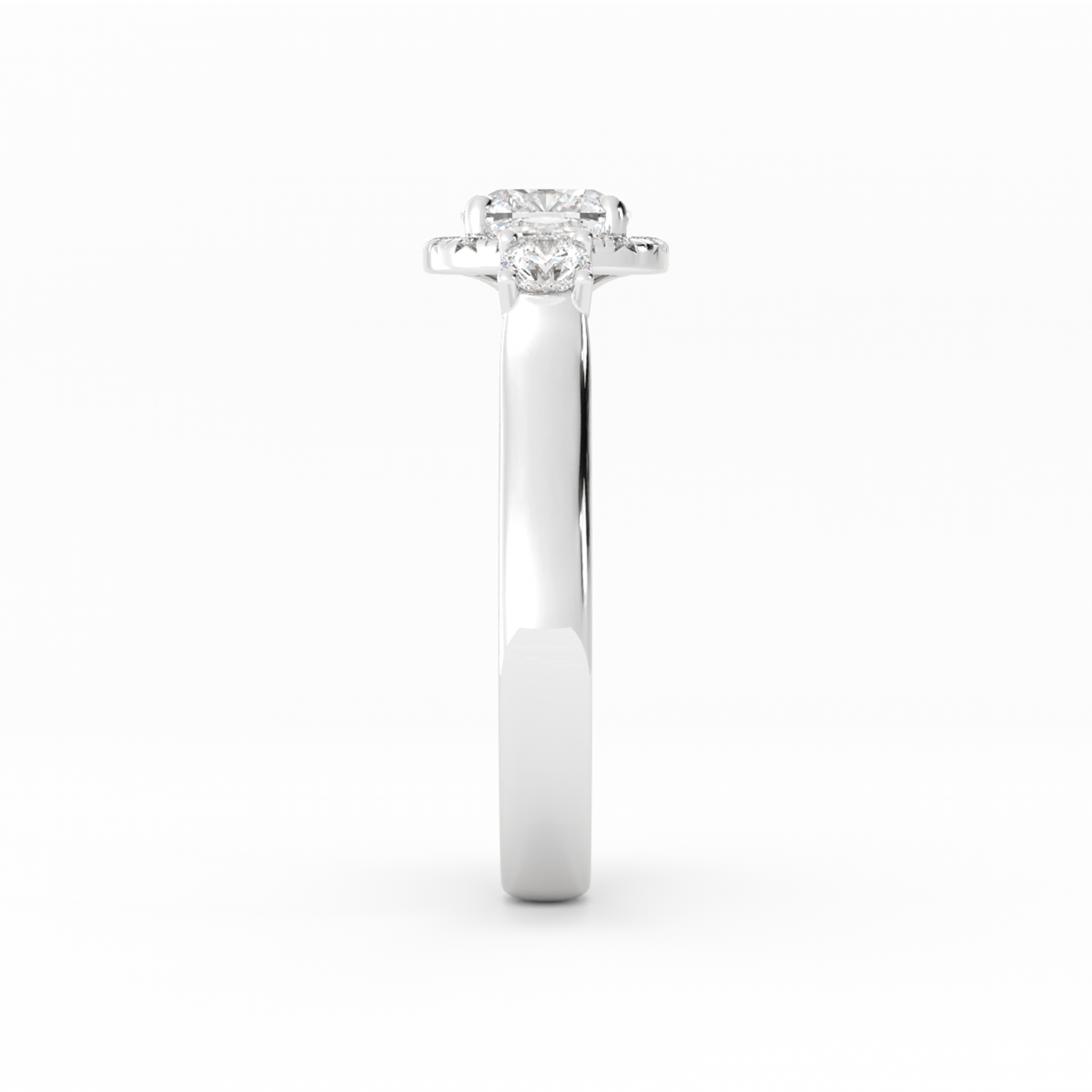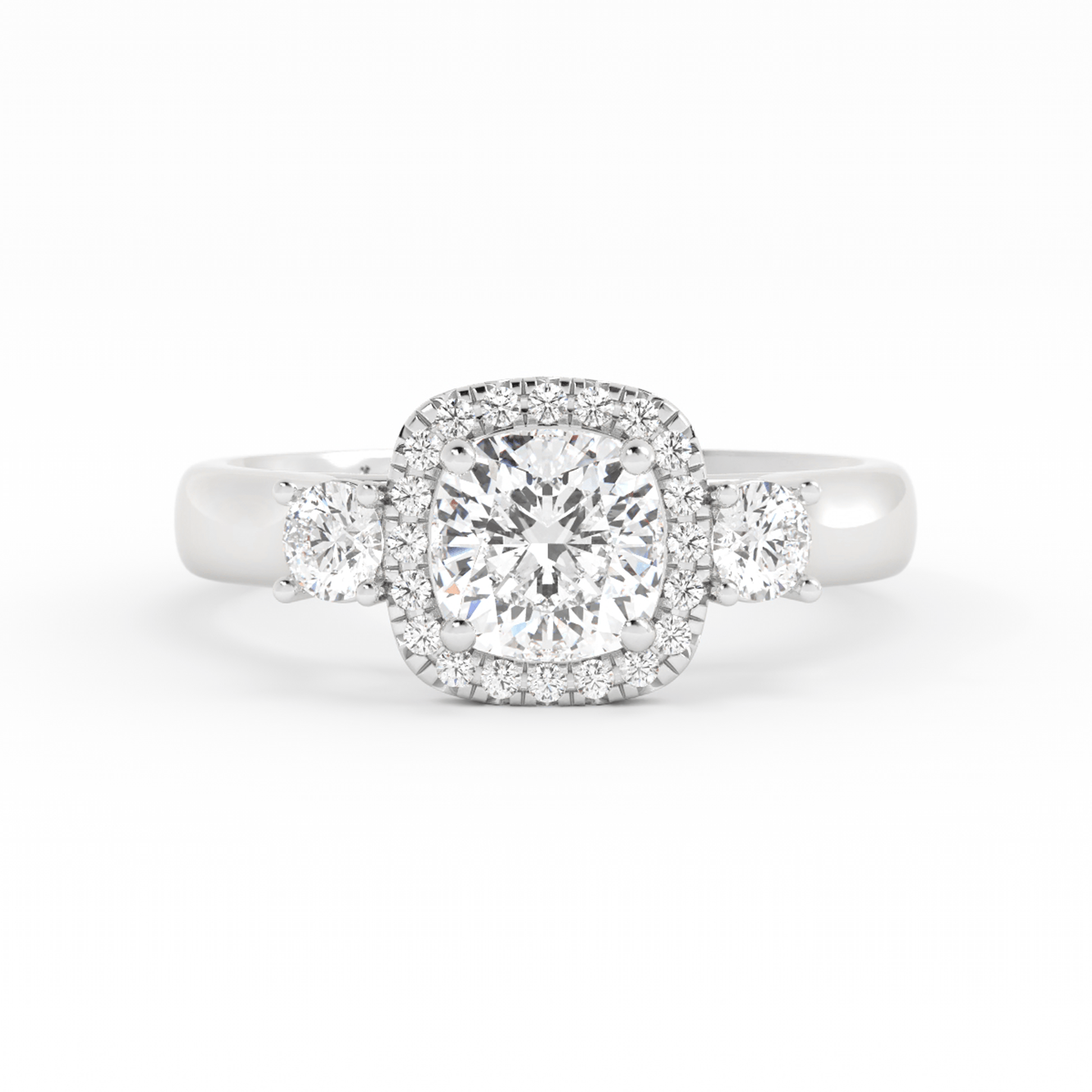 Bold yet timeless, this engagement ring features a cushion-cut center stone encircled by a sparkling halo, adding brilliance and depth. A single accent stone on each side of the shank enhances the design, while the chunky band offers a modern edge and remains perfectly stackable for a striking, layered look.