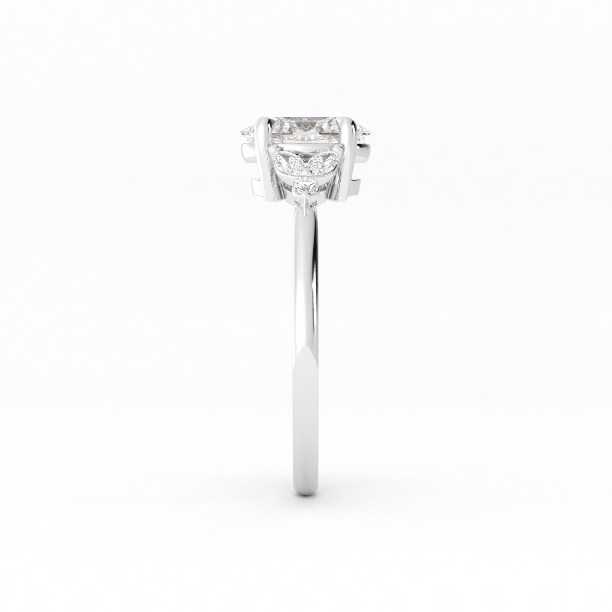Delicate and distinctive, this engagement ring features an oval center stone set with four claw prongs, nestled in a graceful basket setting. On each side, two marquise accent stones create a soft split-shank effect, meeting at a single round accent stone for a touch of symmetry and sparkle. Finished with a dainty band, this design blends elegance and artistry in a beautifully balanced silhouette.