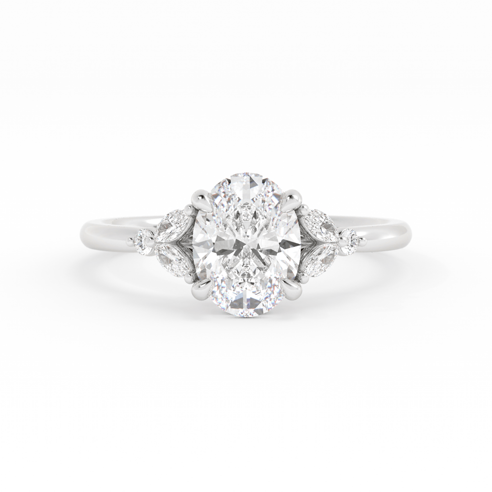 Delicate and distinctive, this engagement ring features an oval center stone set with four claw prongs, nestled in a graceful basket setting. On each side, two marquise accent stones create a soft split-shank effect, meeting at a single round accent stone for a touch of symmetry and sparkle. Finished with a dainty band, this design blends elegance and artistry in a beautifully balanced silhouette.