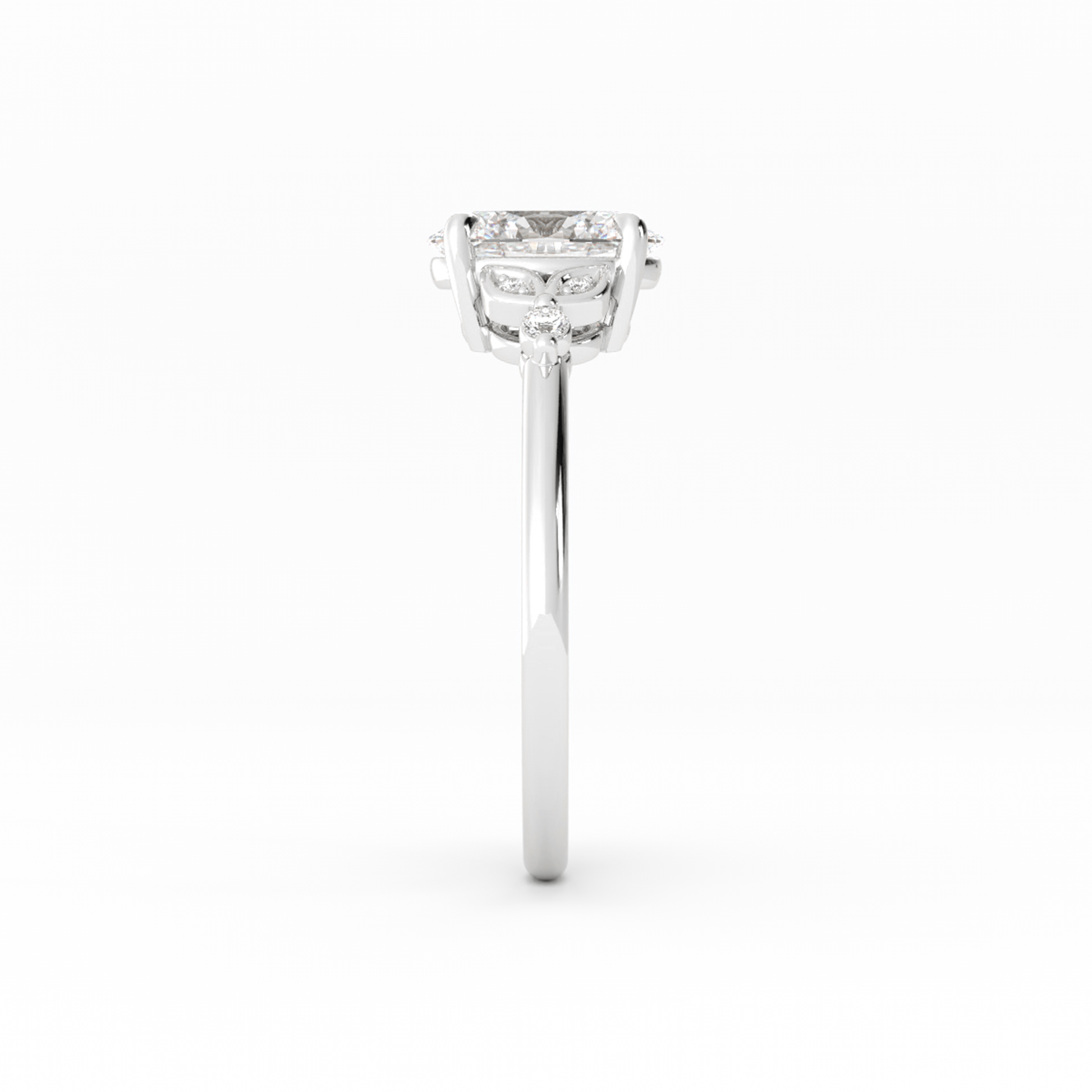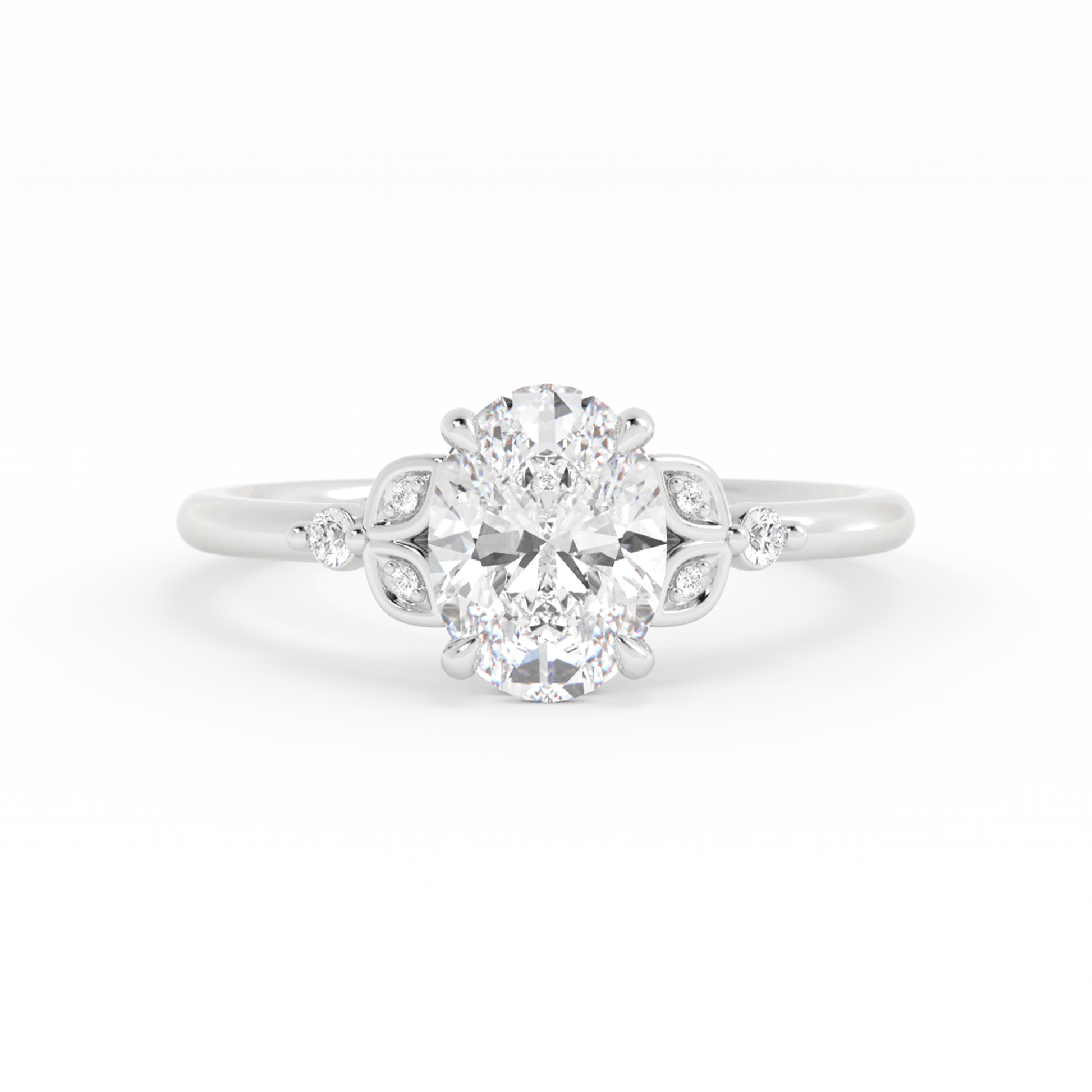 Romantic and refined, this engagement ring features an oval center stone set with four claw prongs in a graceful basket setting. On each side, two round accent stones are framed by delicate metal walls shaped like leaves, meeting at a third round stone where the design converges. Finished with a dainty band, this nature-inspired setting offers a soft, organic elegance with timeless charm.