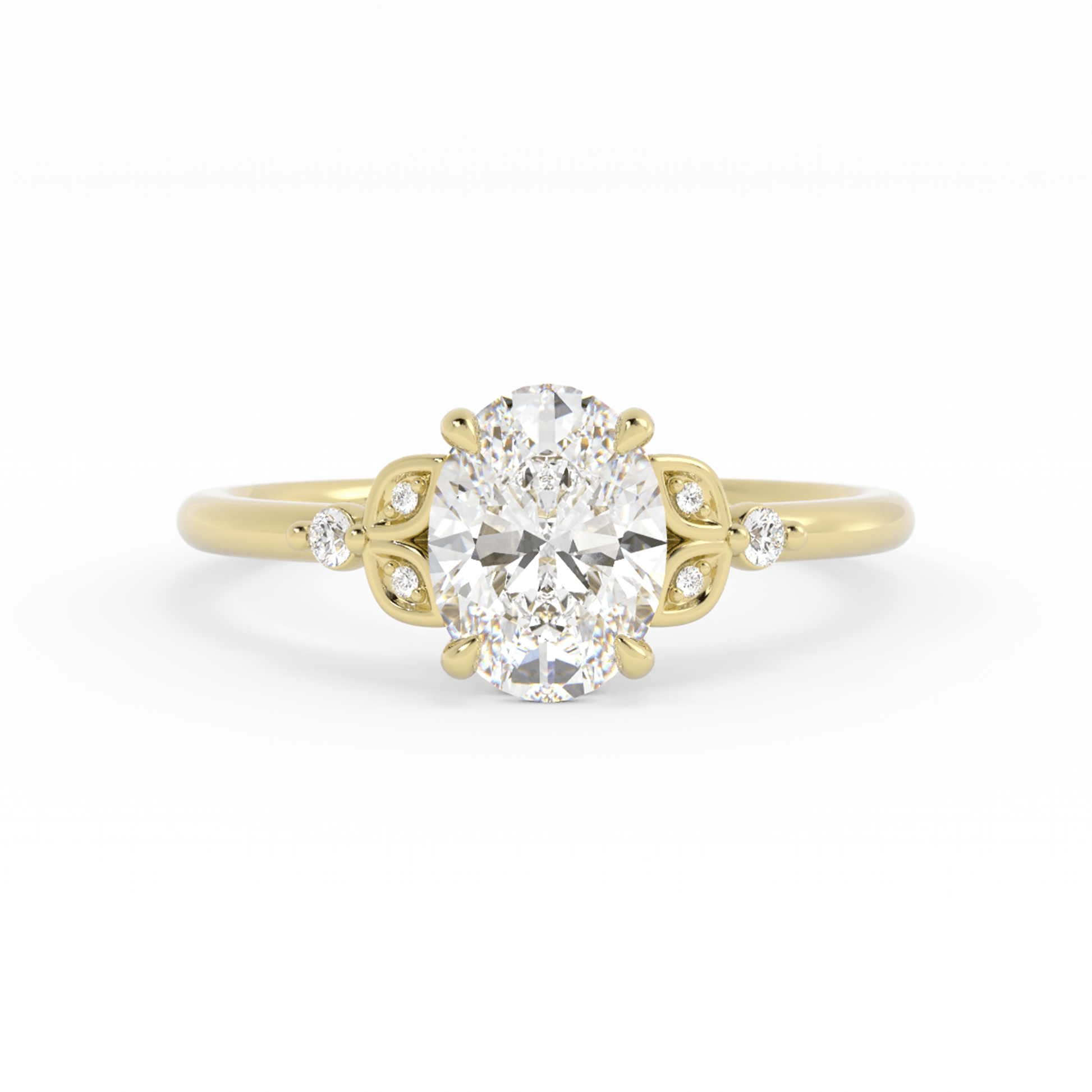 Romantic and refined, this engagement ring features an oval center stone set with four claw prongs in a graceful basket setting. On each side, two round accent stones are framed by delicate metal walls shaped like leaves, meeting at a third round stone where the design converges. Finished with a dainty band, this nature-inspired setting offers a soft, organic elegance with timeless charm.