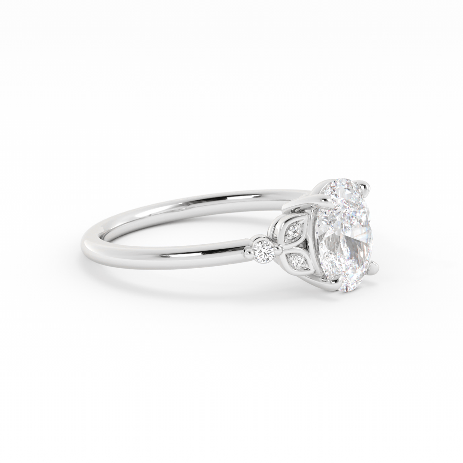 Romantic and refined, this engagement ring features an oval center stone set with four claw prongs in a graceful basket setting. On each side, two round accent stones are framed by delicate metal walls shaped like leaves, meeting at a third round stone where the design converges. Finished with a dainty band, this nature-inspired setting offers a soft, organic elegance with timeless charm.
