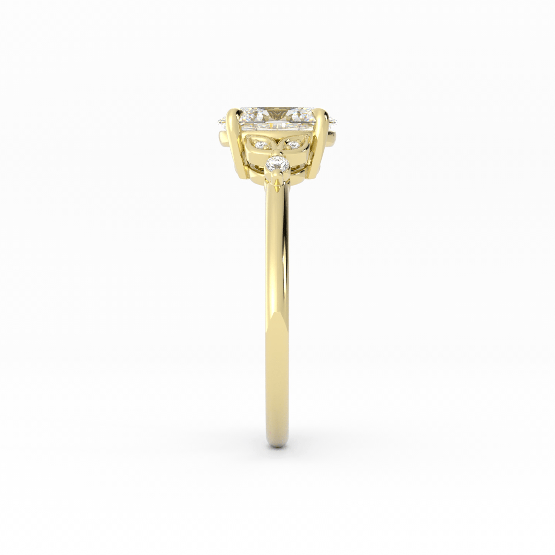 Romantic and refined, this engagement ring features an oval center stone set with four claw prongs in a graceful basket setting. On each side, two round accent stones are framed by delicate metal walls shaped like leaves, meeting at a third round stone where the design converges. Finished with a dainty band, this nature-inspired setting offers a soft, organic elegance with timeless charm.