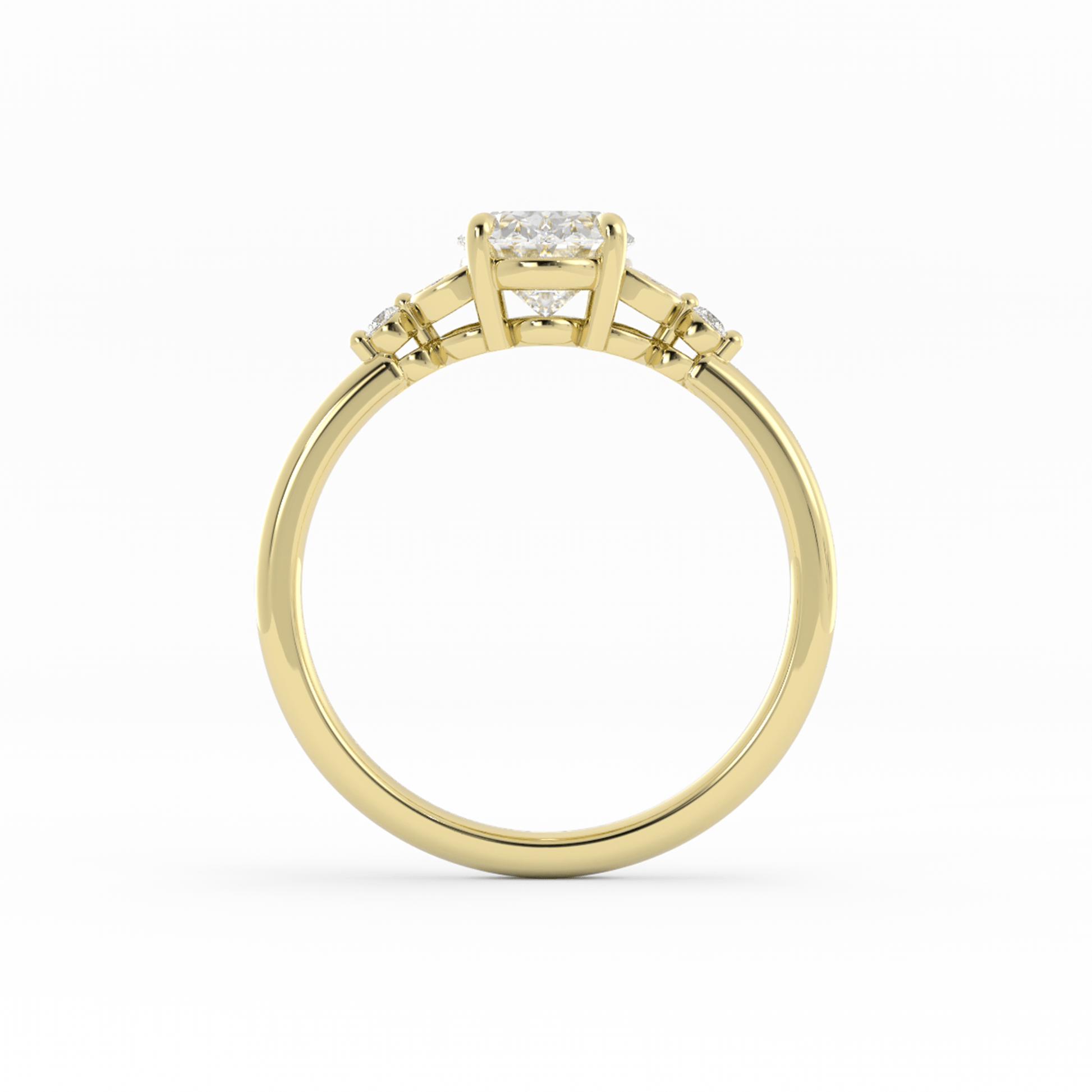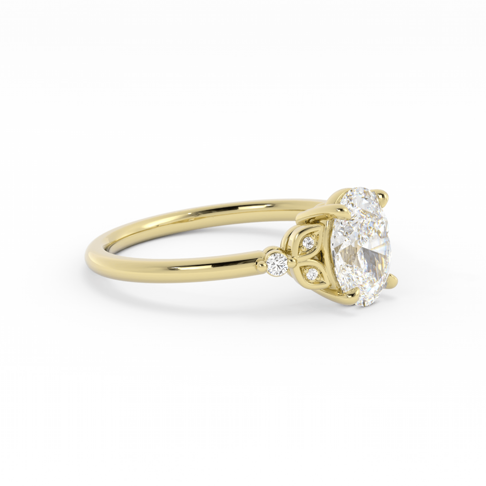 Romantic and refined, this engagement ring features an oval center stone set with four claw prongs in a graceful basket setting. On each side, two round accent stones are framed by delicate metal walls shaped like leaves, meeting at a third round stone where the design converges. Finished with a dainty band, this nature-inspired setting offers a soft, organic elegance with timeless charm.