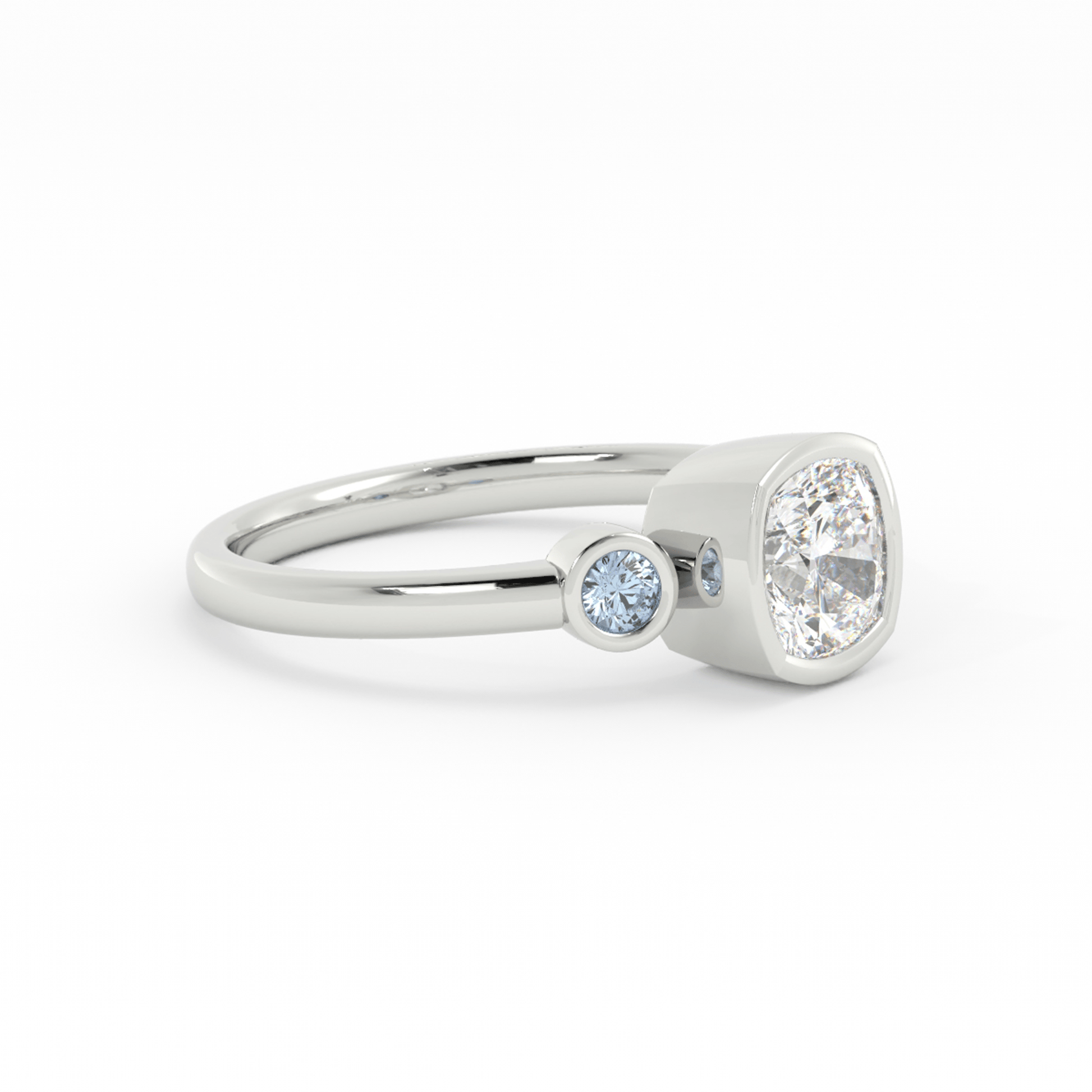 Experience the perfect blend of brilliance and tranquility with the Selene Lab-Grown Diamond and Aquamarine Three-Stone Engagement Ring, a signature design from the Olympia Collection. At the heart of this elegant piece is a stunning 1ct cushion-cut lab-grown diamond, radiating timeless brilliance. On either side, two round aquamarine gemstones bring a serene, ocean-inspired hue, symbolizing harmony and clarity in your love story.