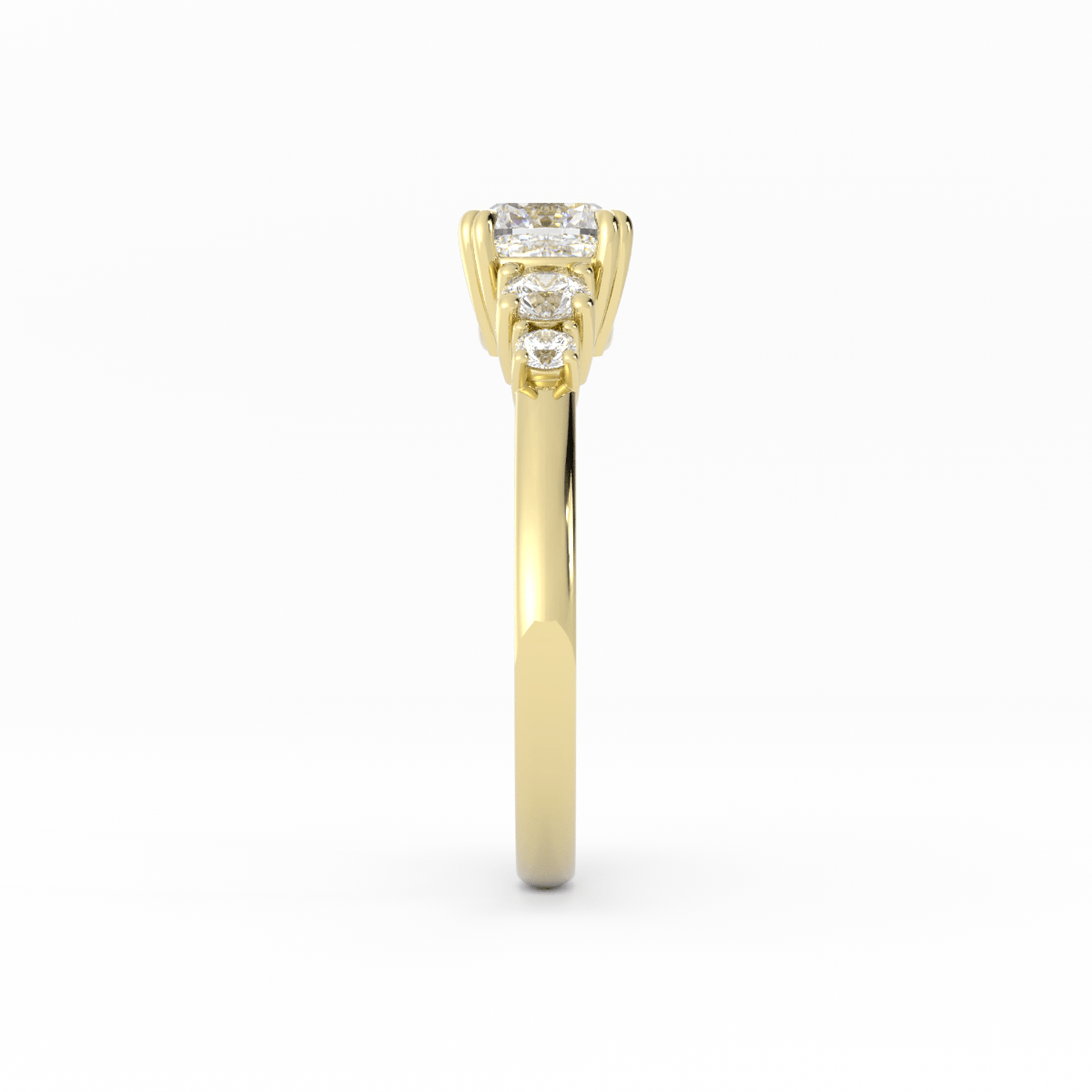 Elegant and timeless, this engagement ring features a cushion-cut center stone secured by four double claw prongs, highlighting its soft, square silhouette. On each side, two graduating round accent stones are set in a graceful basket setting, adding balanced sparkle and a sense of gentle flow. Finished with a refined band, this design offers a classic look with thoughtful detail and enduring beauty.