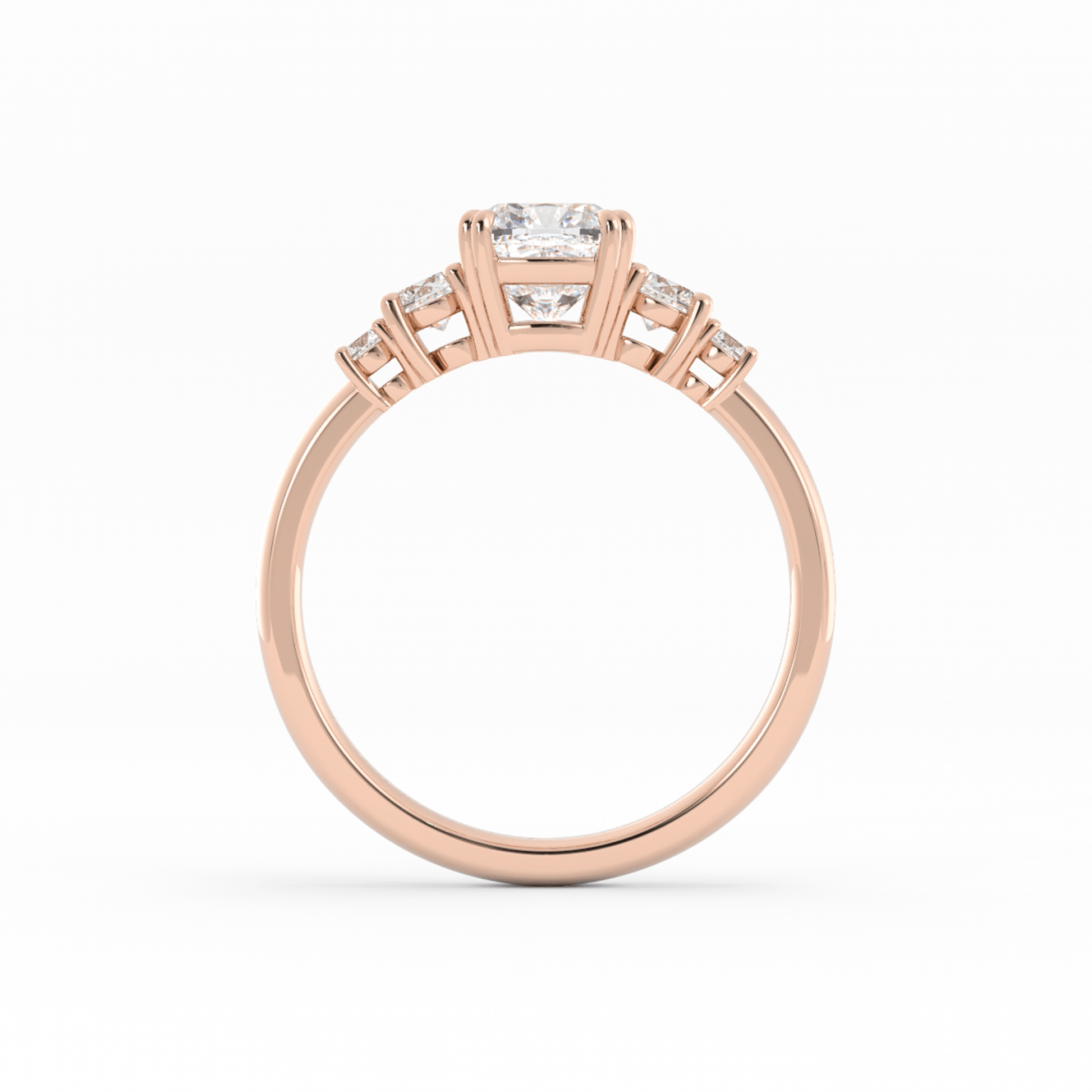 Elegant and timeless, this engagement ring features a cushion-cut center stone secured by four double claw prongs, highlighting its soft, square silhouette. On each side, two graduating round accent stones are set in a graceful basket setting, adding balanced sparkle and a sense of gentle flow. Finished with a refined band, this design offers a classic look with thoughtful detail and enduring beauty.