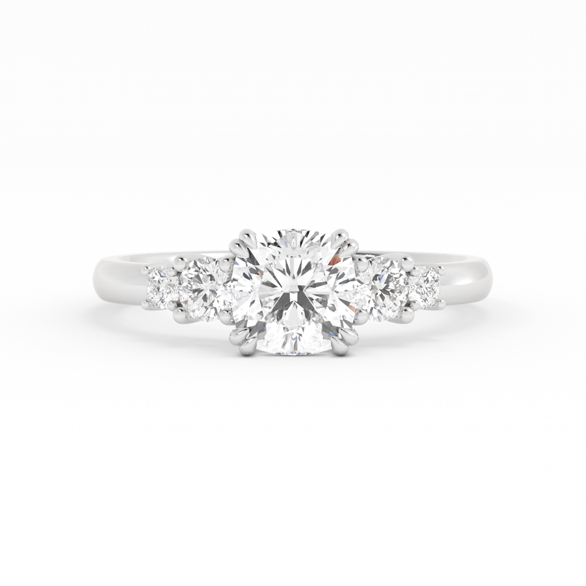 Elegant and timeless, this engagement ring features a cushion-cut center stone secured by four double claw prongs, highlighting its soft, square silhouette. On each side, two graduating round accent stones are set in a graceful basket setting, adding balanced sparkle and a sense of gentle flow. Finished with a refined band, this design offers a classic look with thoughtful detail and enduring beauty.