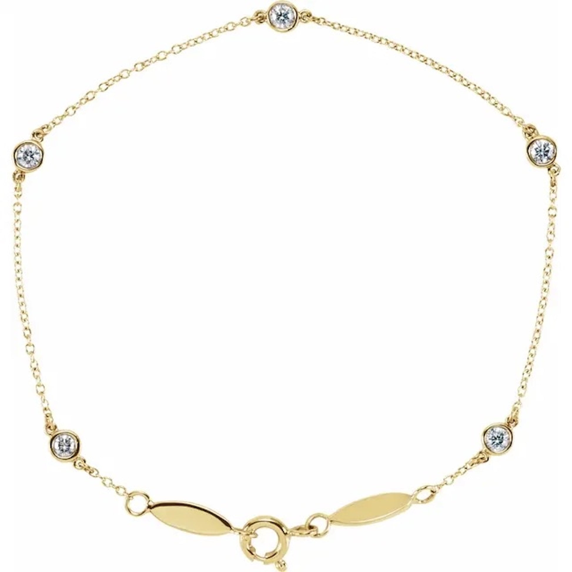 "An exquisite display of elegance and subtle luxury, this 7-inch bracelet is adorned with five brilliant bezel-set diamonds, each one carefully selected for its exceptional sparkle. The diamonds, set along the delicate chain, are beautifully encased in sleek, smooth bezels that enhance their natural brilliance while offering a modern, minimalist aesthetic. The bracelet’s refined design allows the diamonds to take center stage, their radiant facets catching the light with every movement. Perfectly sized for a graceful fit, the bracelet is secured with a sturdy clasp, ensuring both comfort and style. Whether worn as a standalone statement piece or paired with other fine jewelry, this bracelet embodies timeless sophistication, making it a perfect addition to any collection or a memorable gift for someone special."