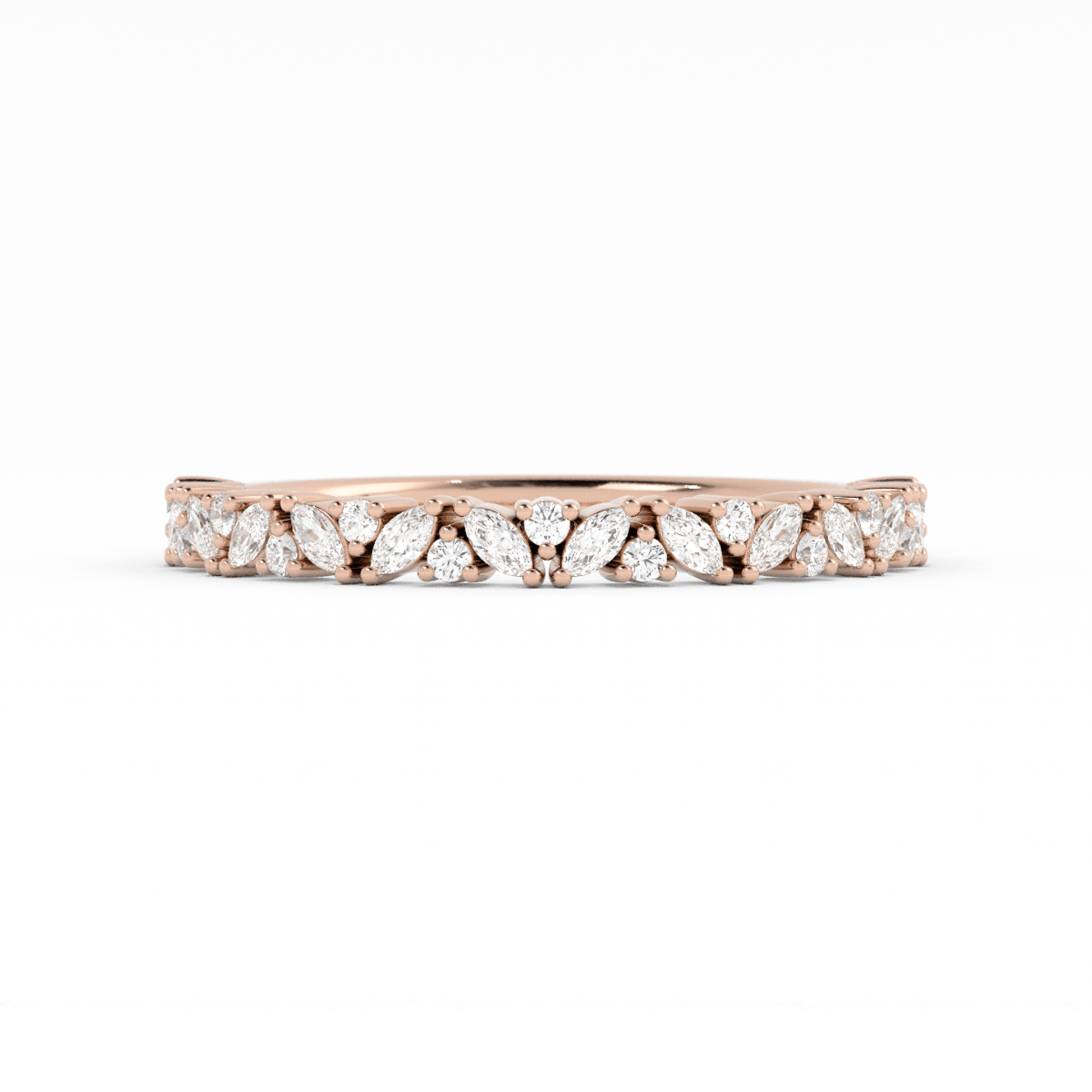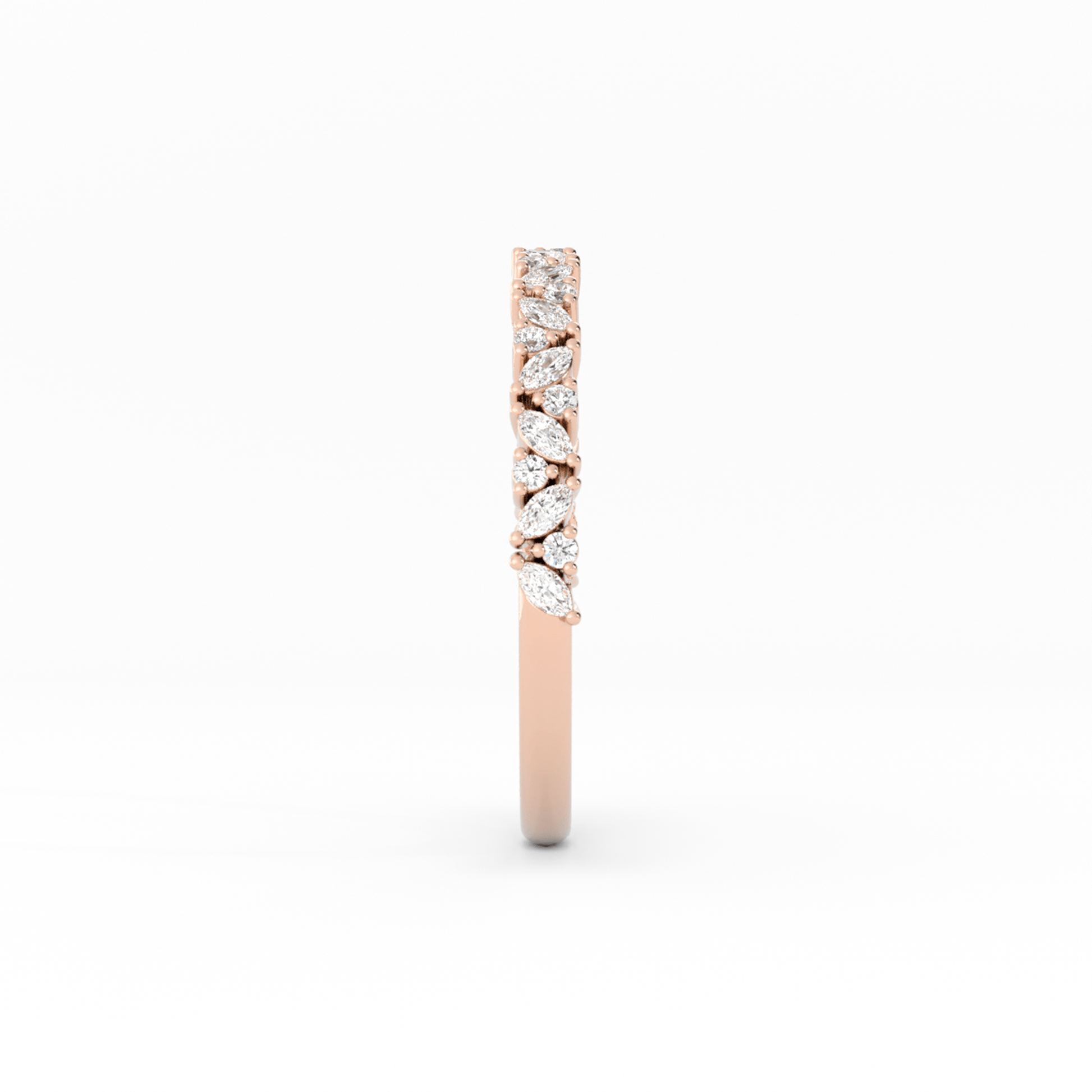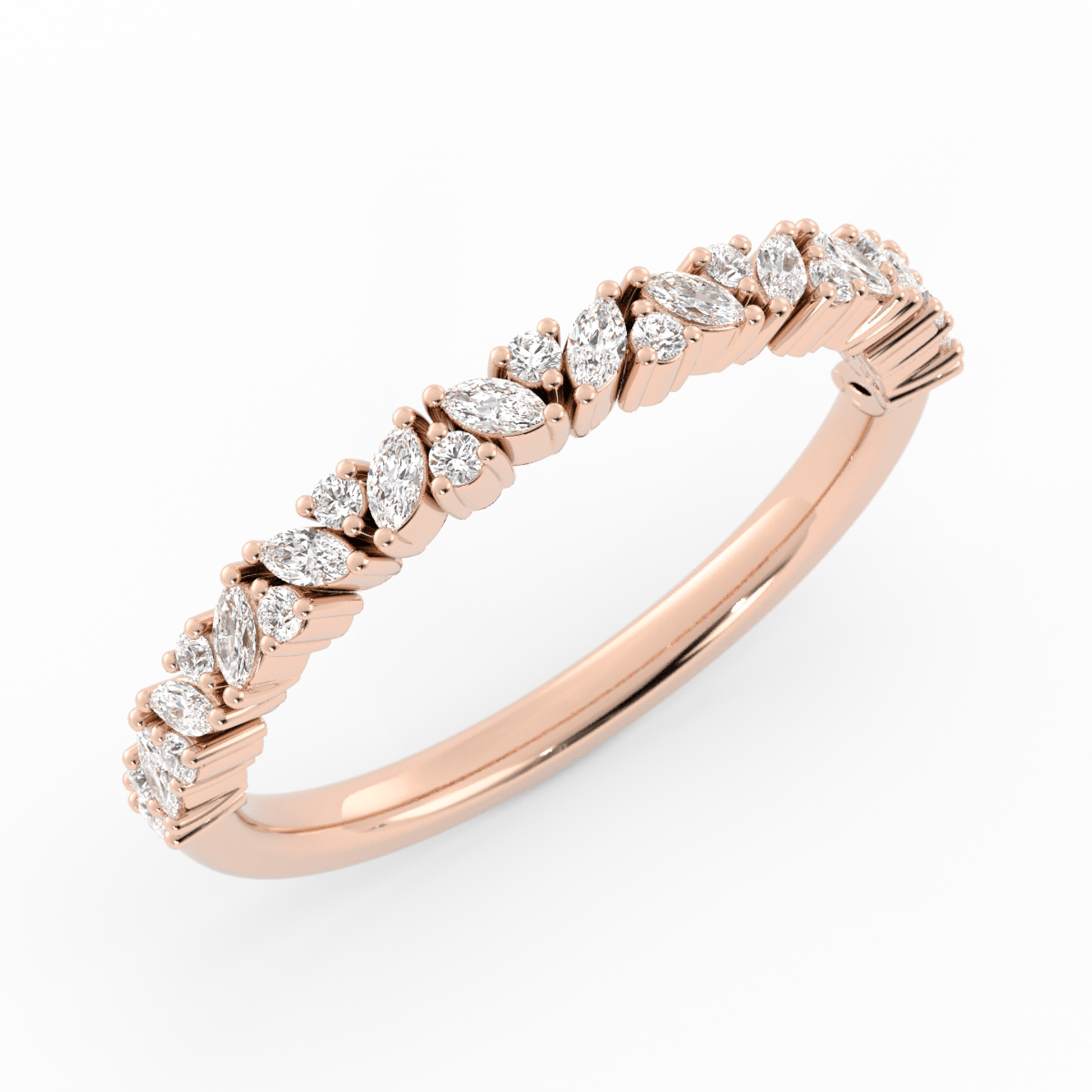 A dance of light and shape, this band showcases marquise stones teetering elegantly along the half-shank, their angled forms interspersed with bright round stones. The result is a beautifully balanced design that’s both sophisticated and delightfully whimsical.