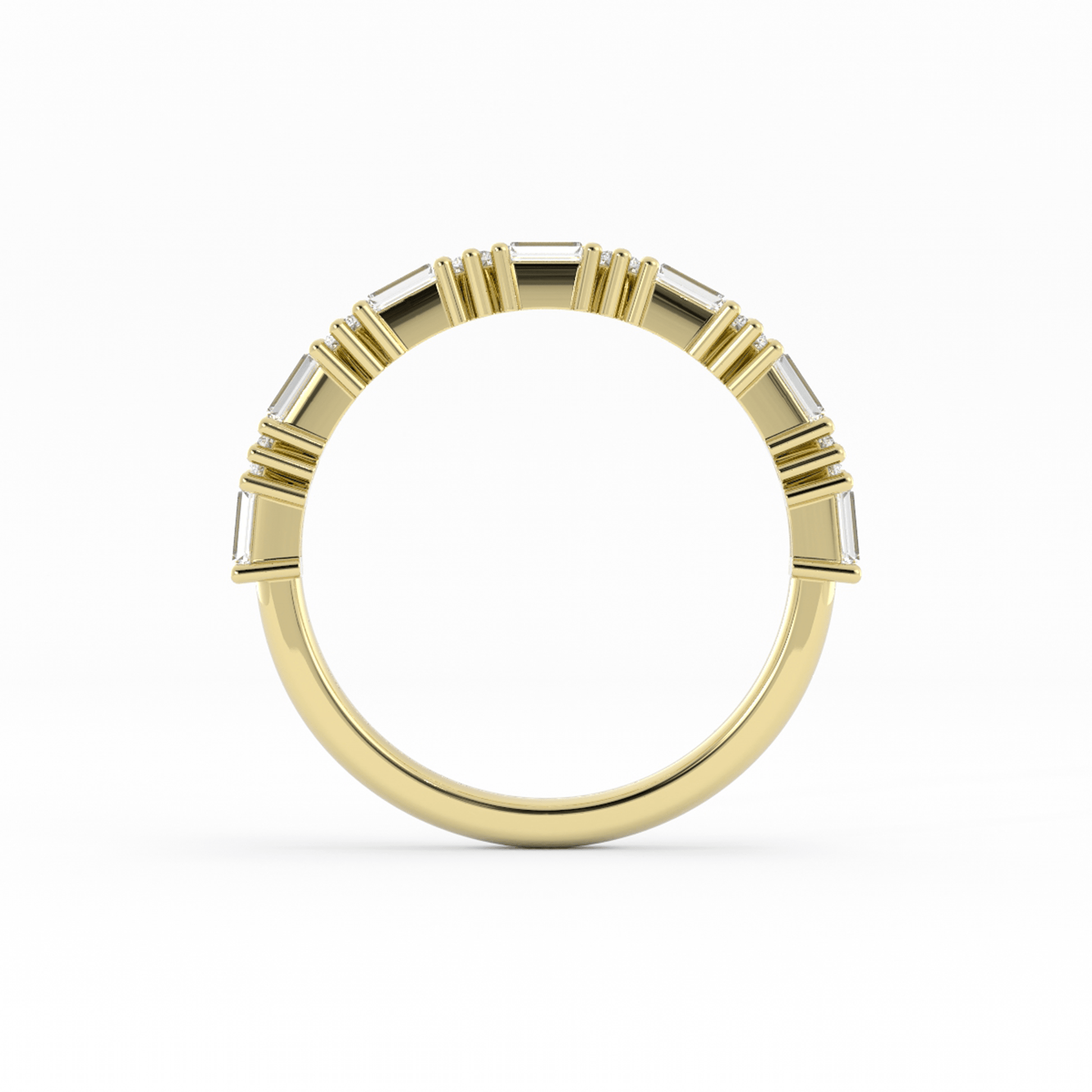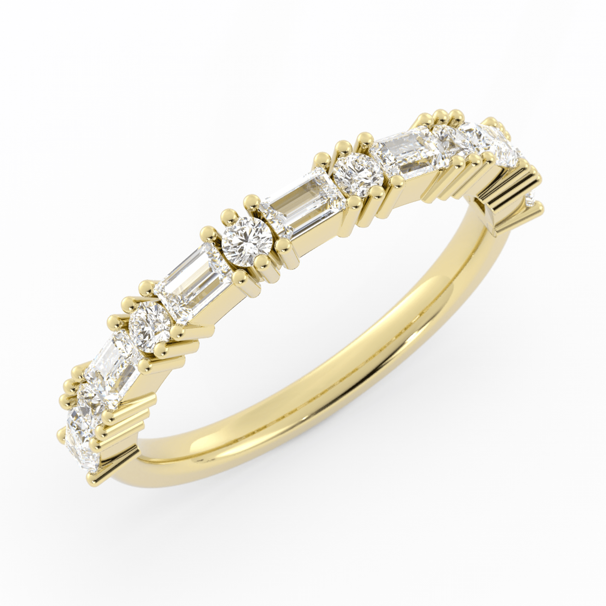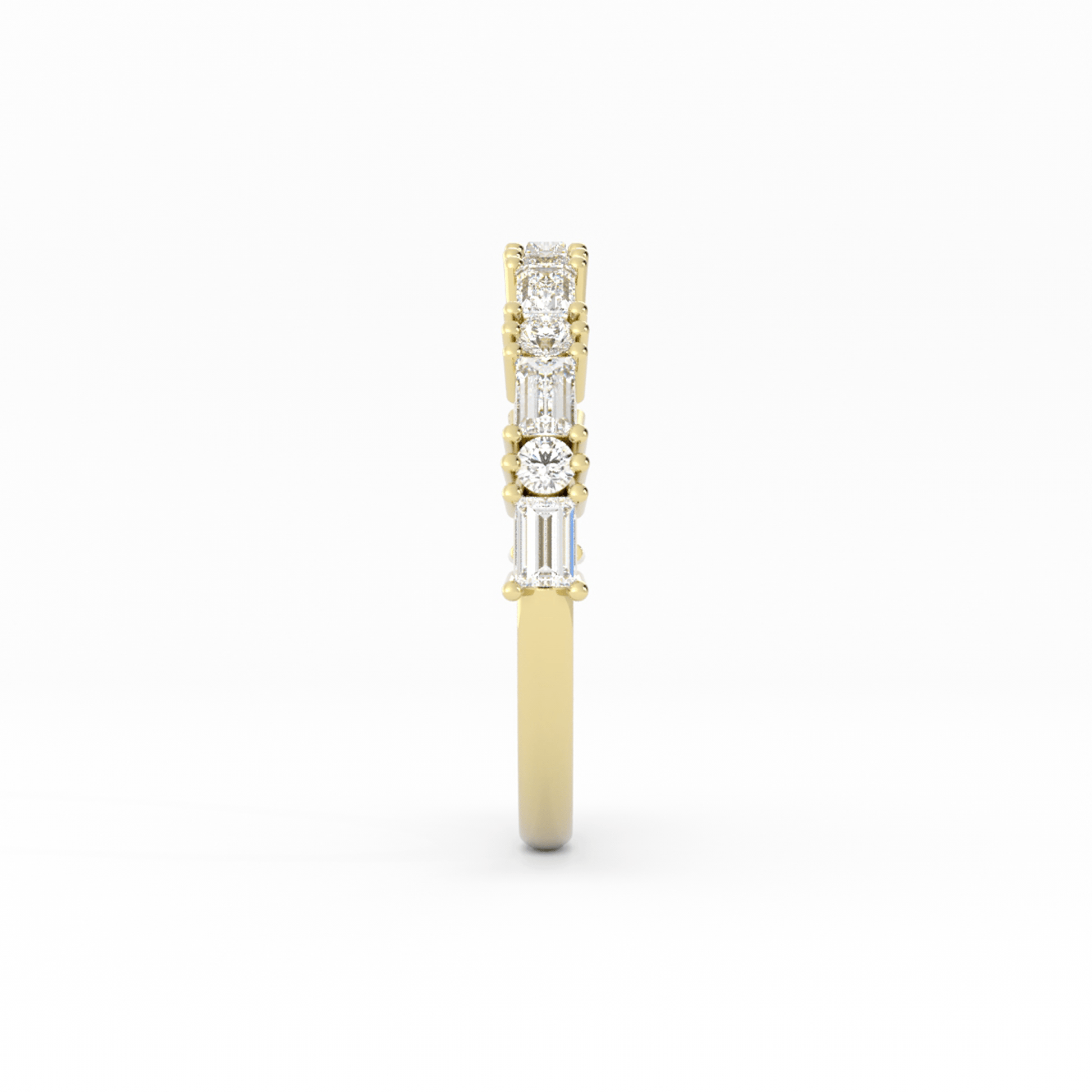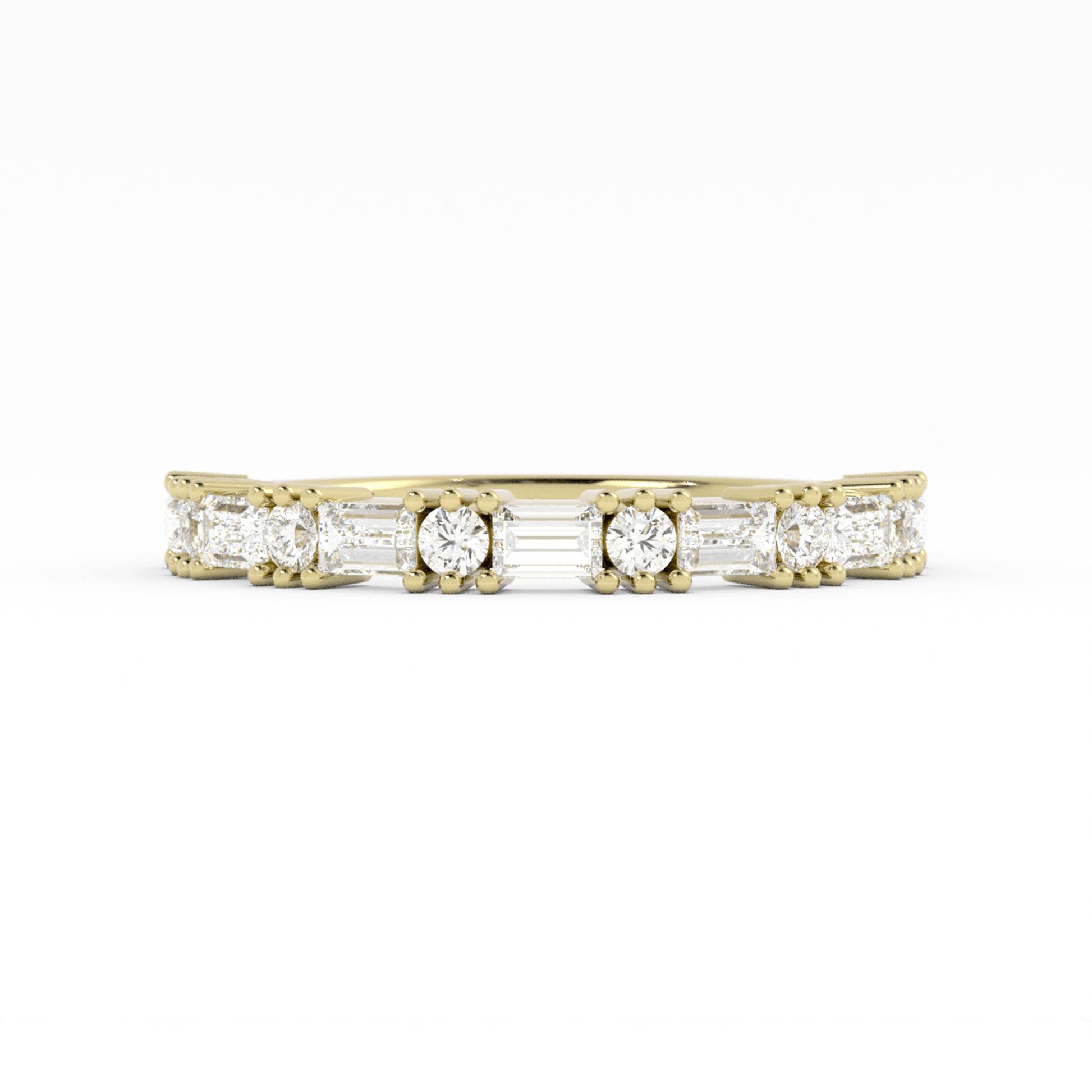 With a graceful mix of round and baguette stones set along the half-shank, this band offers a sleek, linear silhouette. Its understated elegance makes it ideal for stacking or wearing solo with effortless sophistication.