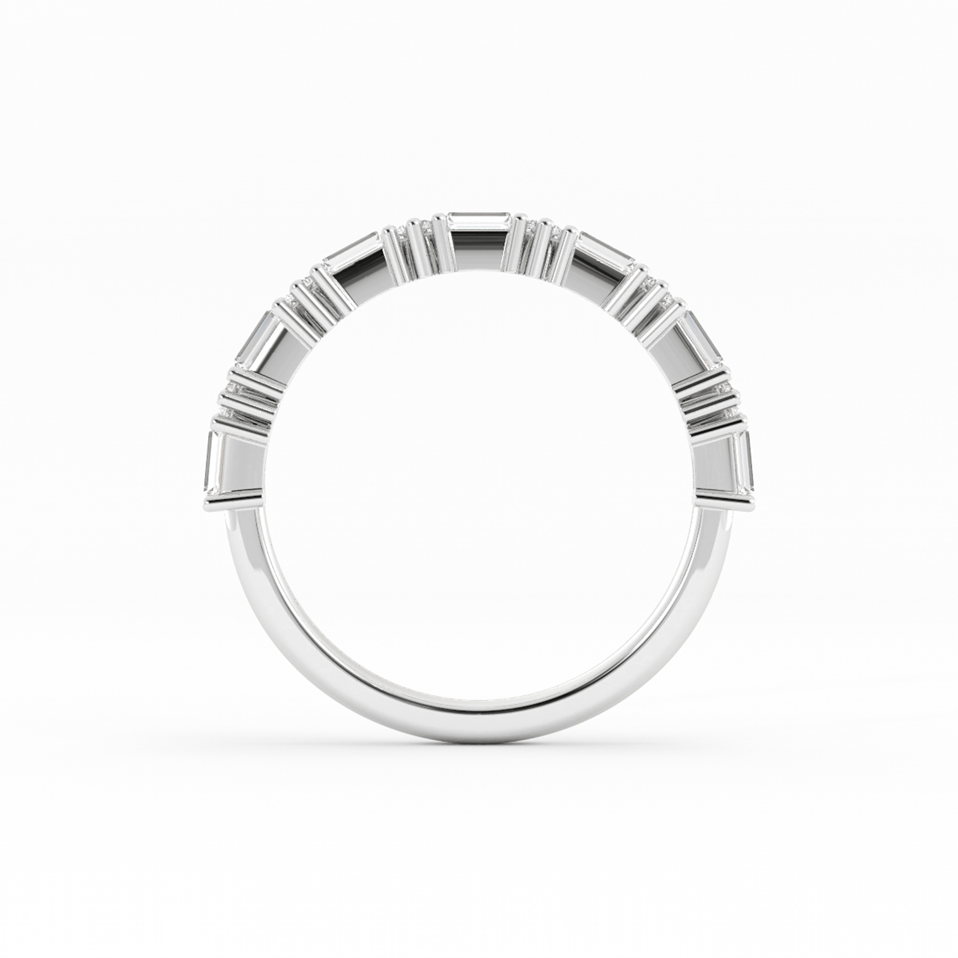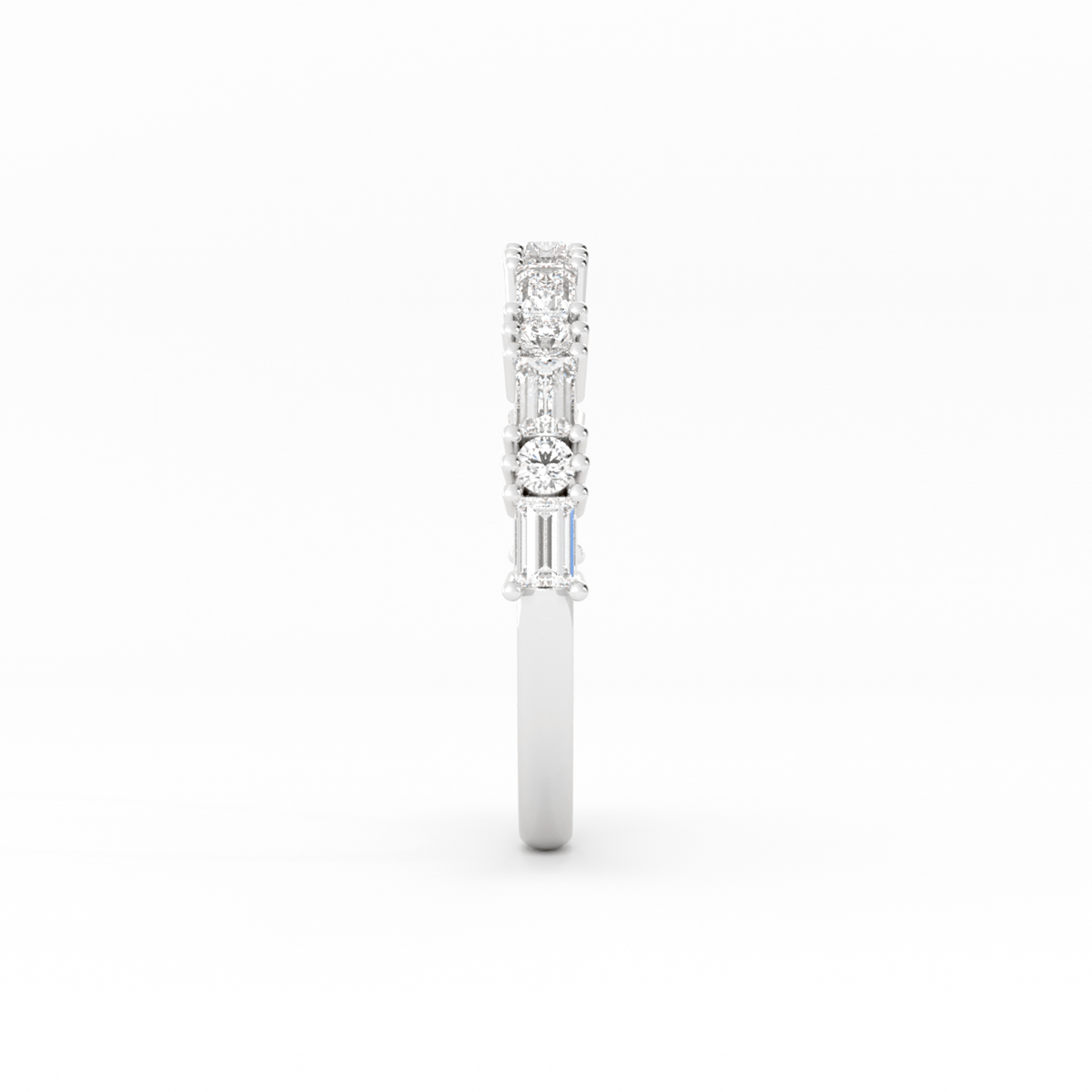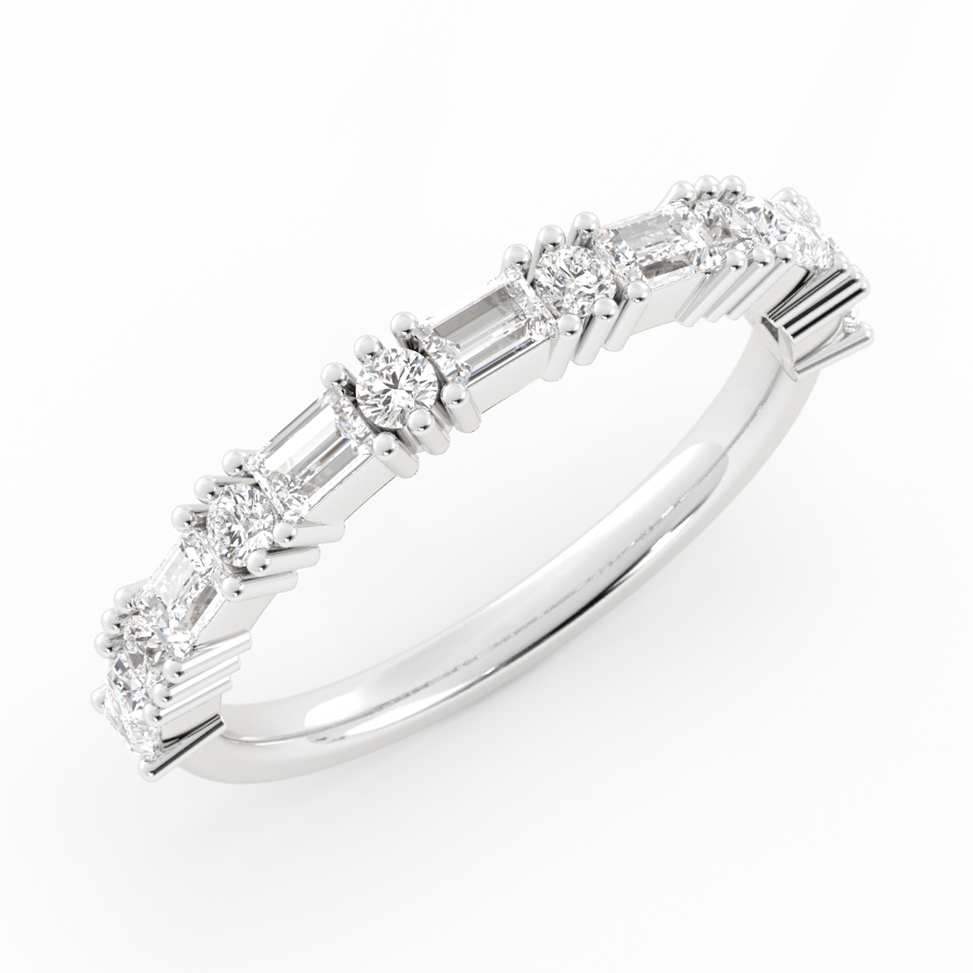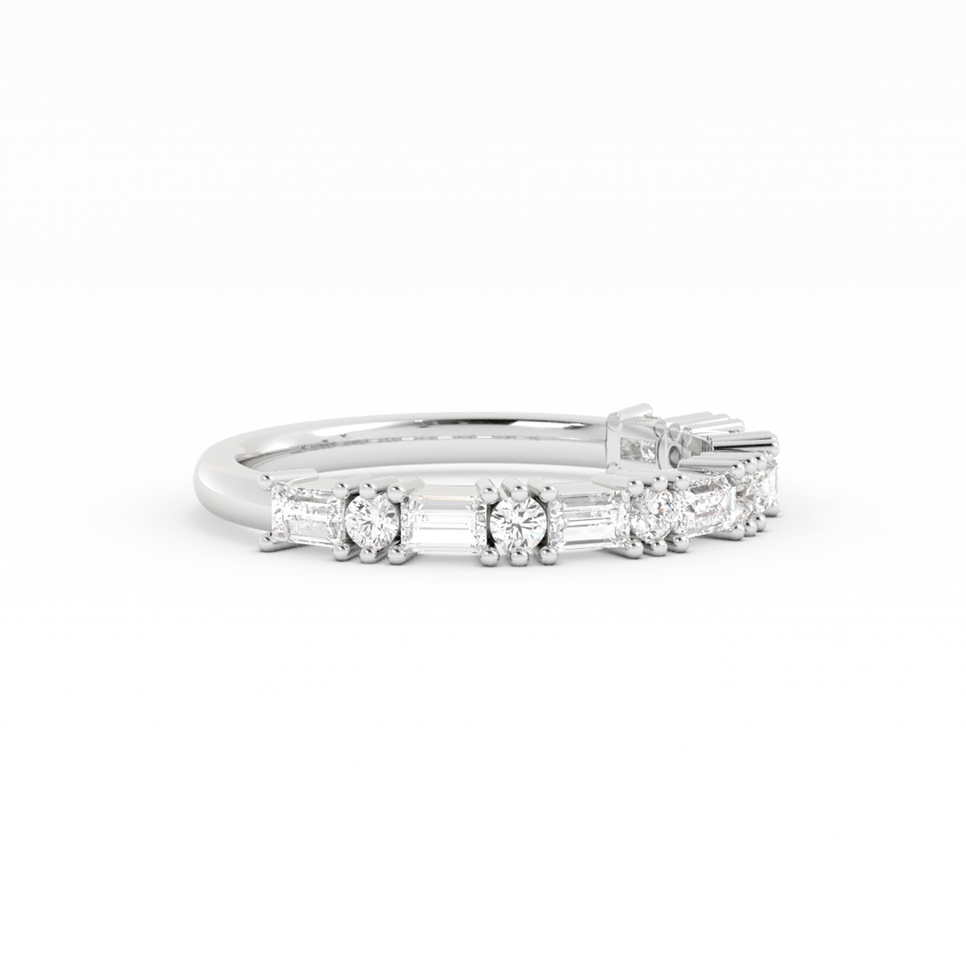 With a graceful mix of round and baguette stones set along the half-shank, this band offers a sleek, linear silhouette. Its understated elegance makes it ideal for stacking or wearing solo with effortless sophistication.