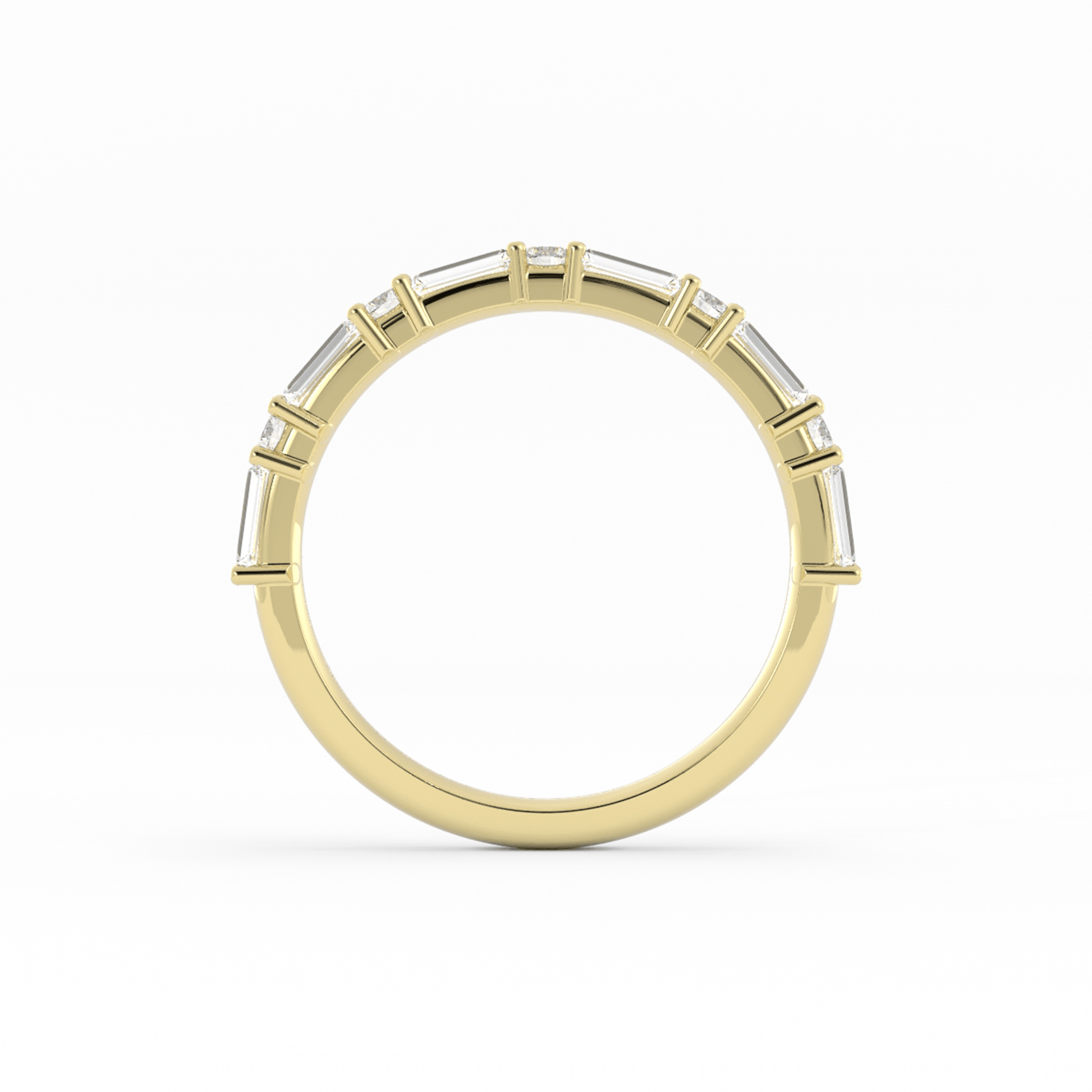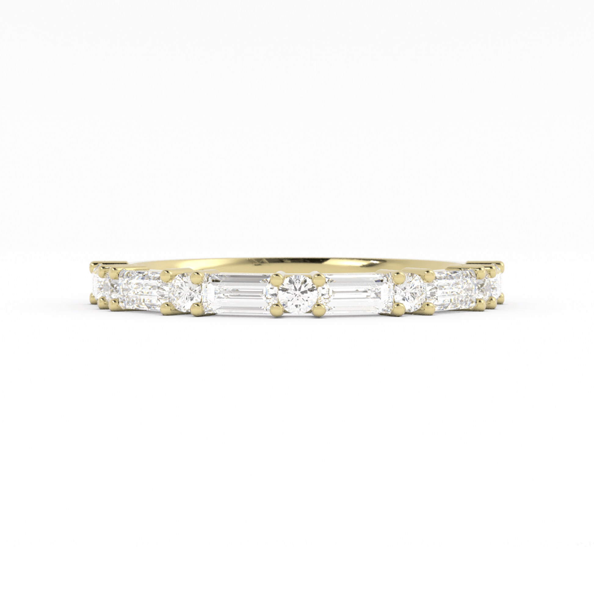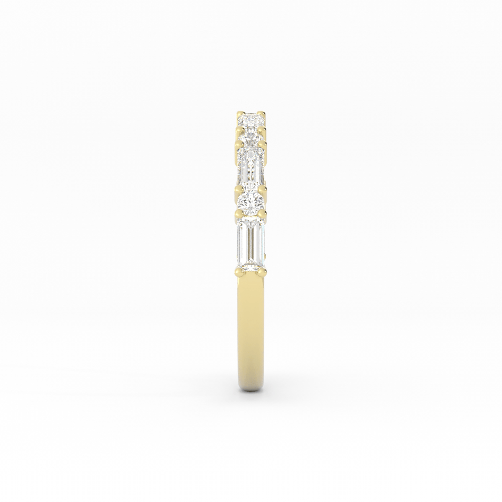 Minimalist in form, this half-eternity band features alternating round and baguette stones set with shared prongs for a seamless, structured look. The clean lines and balanced geometry create a timeless design that’s effortlessly elegant—perfect for stacking or standing alone with quiet confidence.