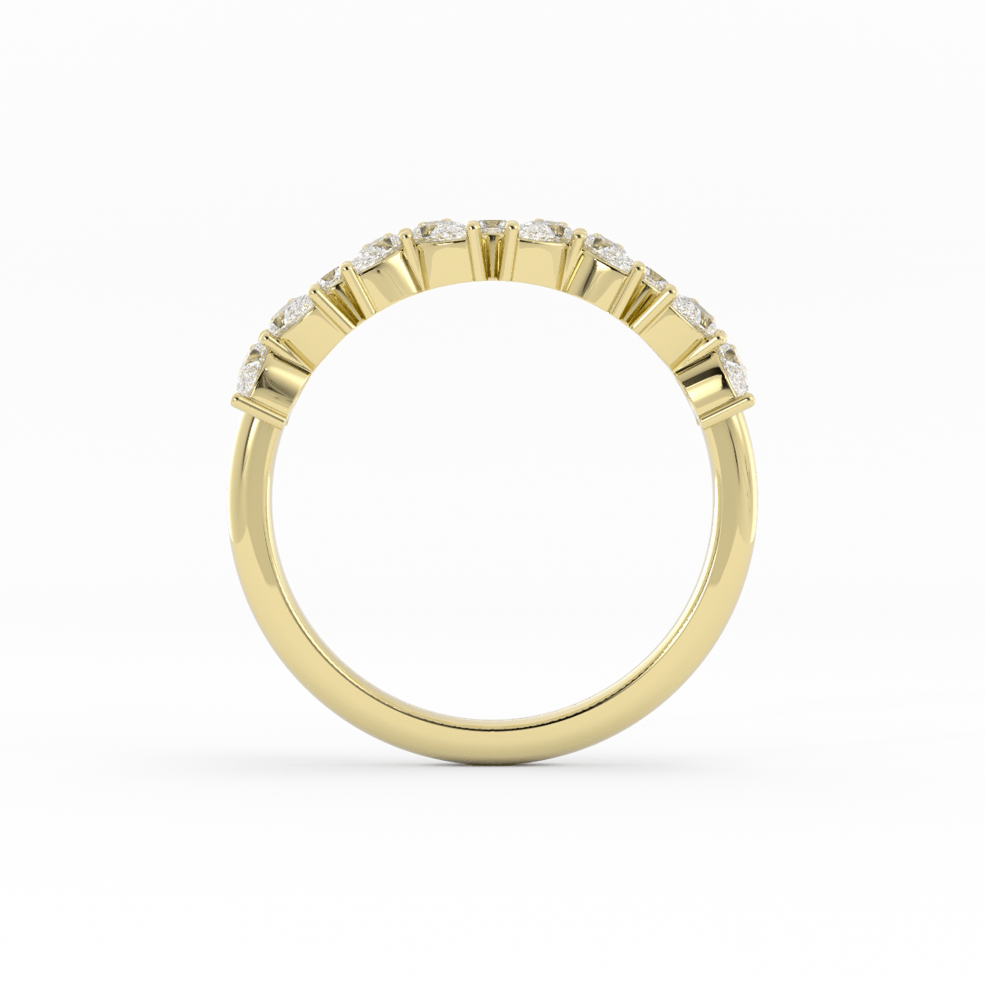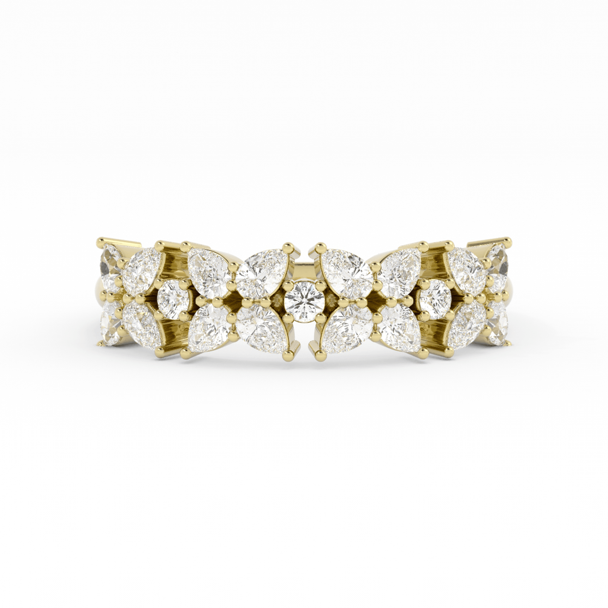 Crafted to evoke the gentle beauty of a flower garden, this band pairs clusters of pear stones shaped into blooms with round stones connecting them in a continuous daisy-chain pattern. Light, airy, and utterly captivating, it’s a celebration of grace and joy.
