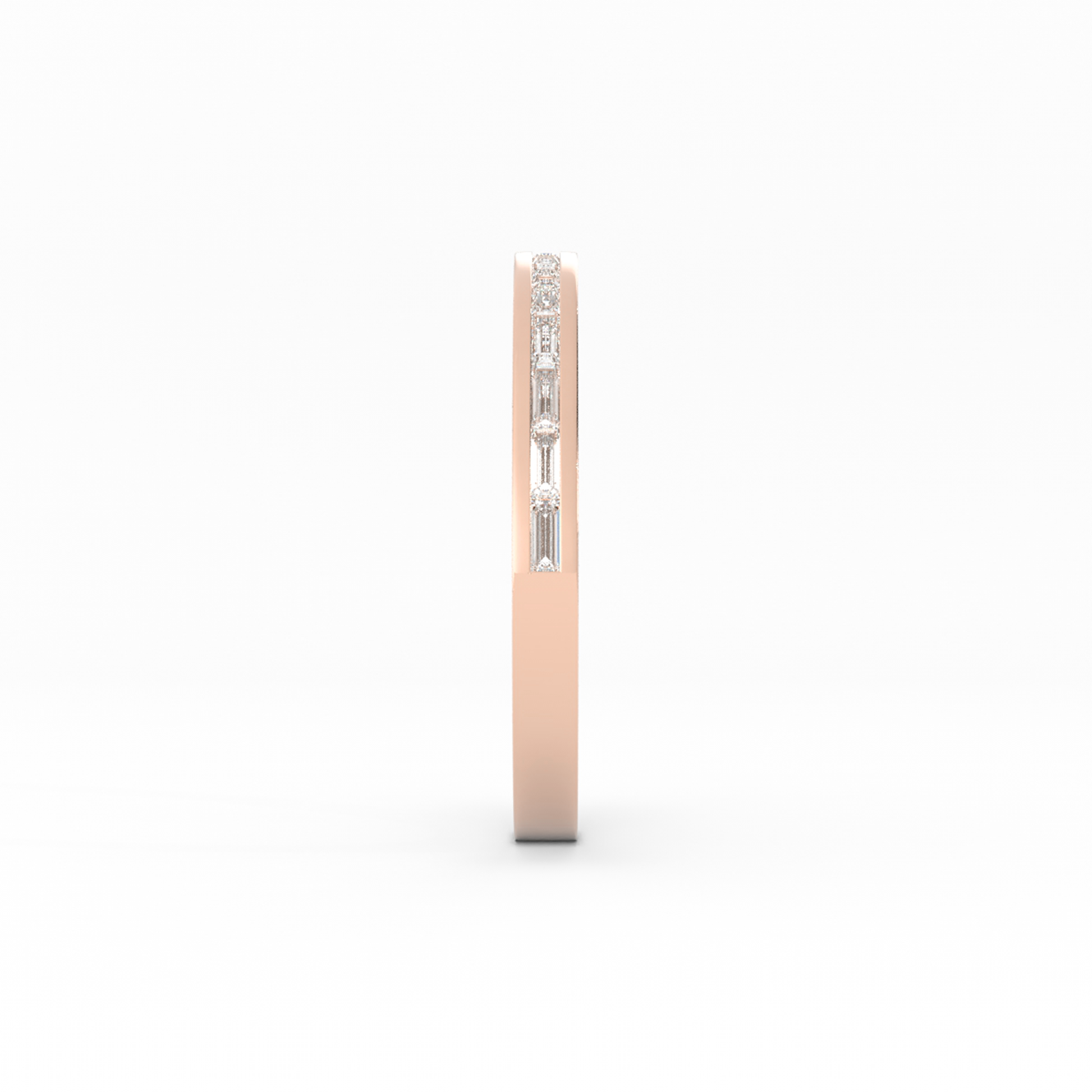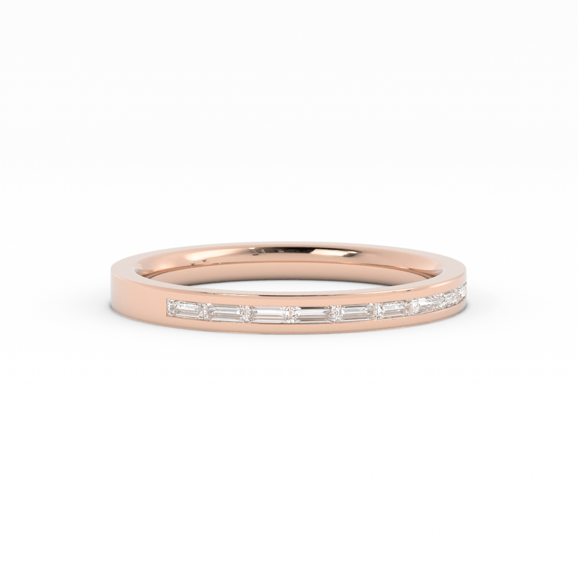 This piece is defined by clean lines and beautiful symmetry. A line of channel-set baguette diamonds lay across the top half of the band, creating a linear silhouette for the perfect stacking ring or standalone piece.