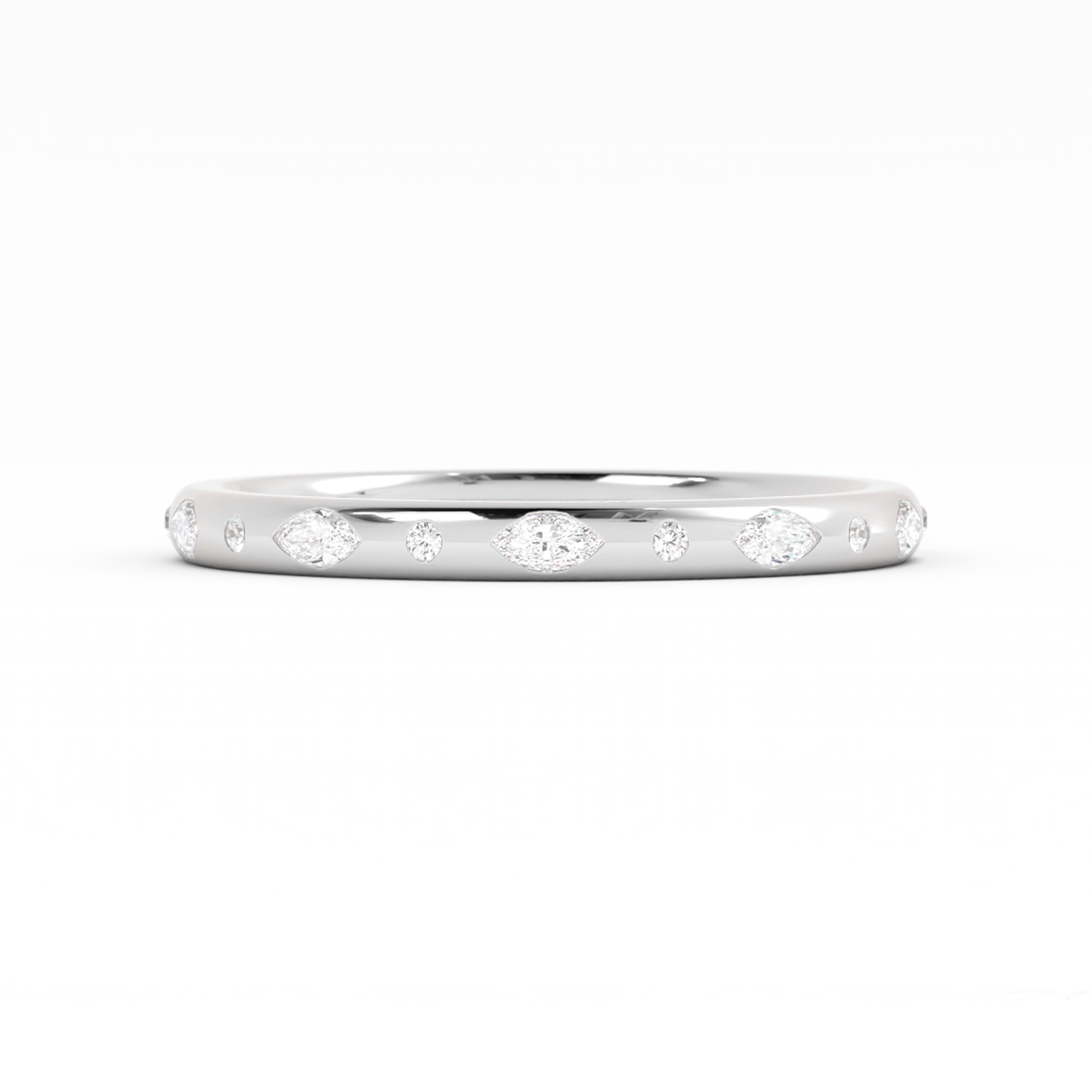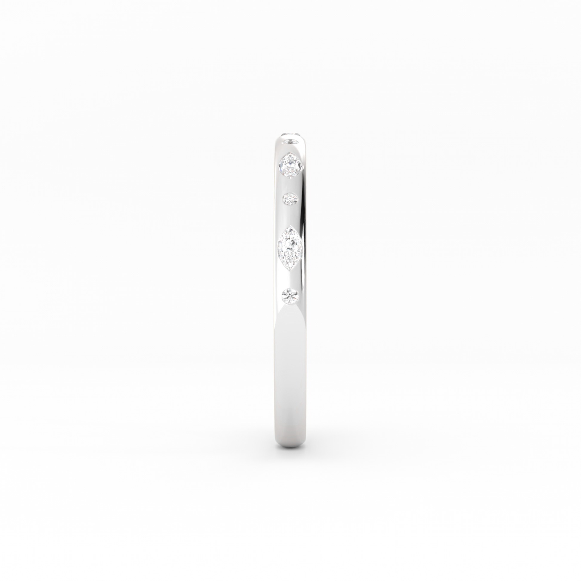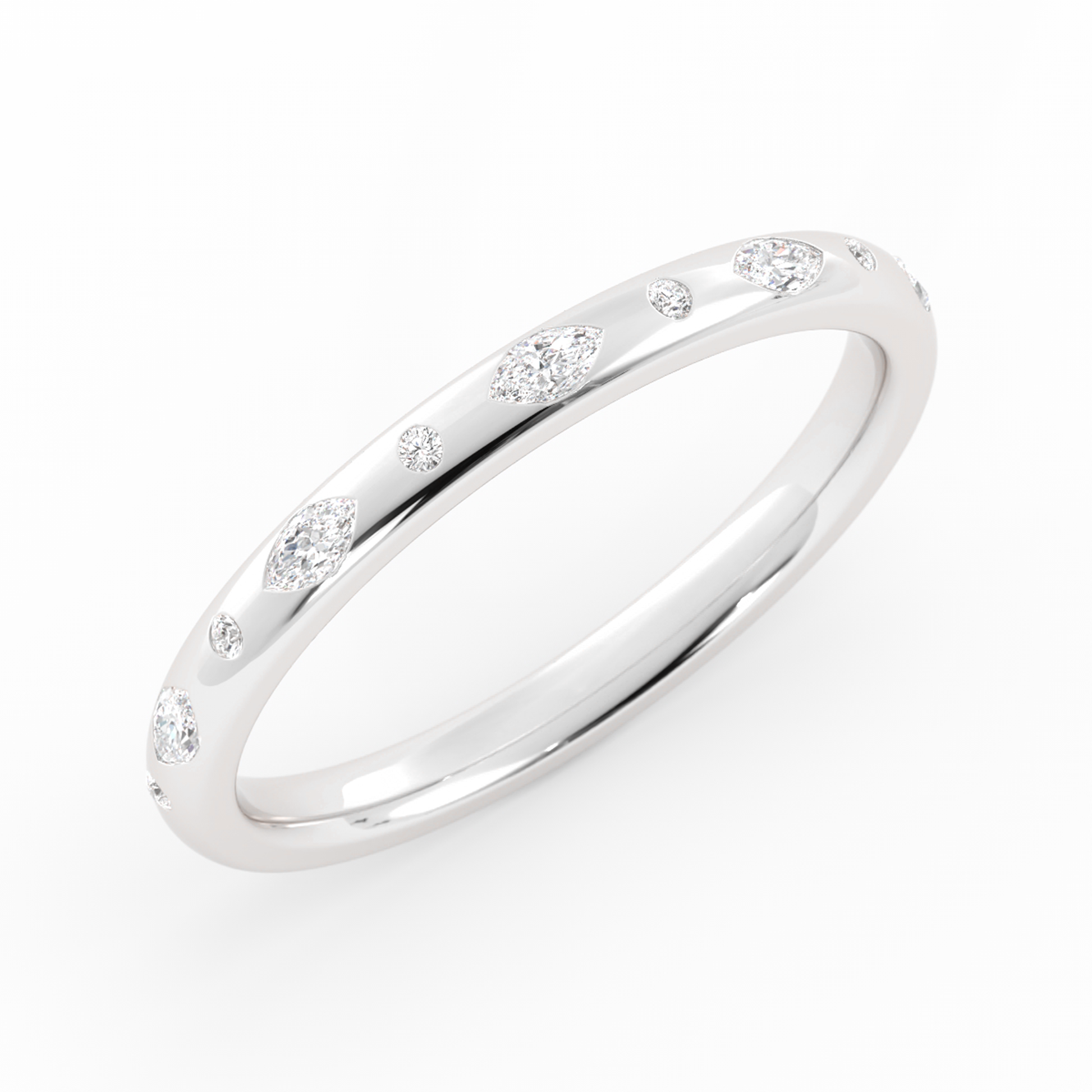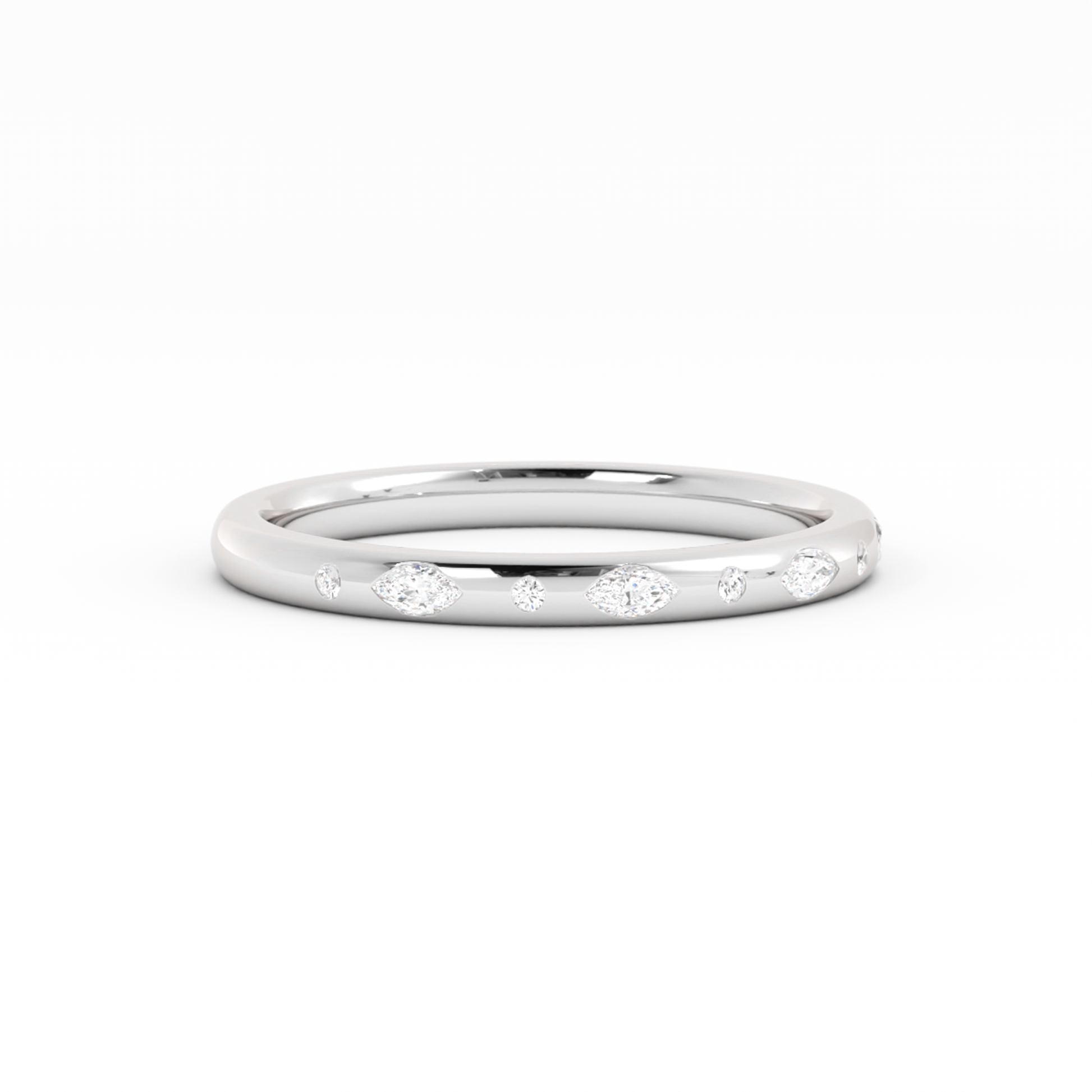 This sleek design features scattered pear and round accents that dance across the surface, creating a refined yet playful sparkle. Its clean silhouette offers a timeless elegance, perfect for both stacking and solo wear.