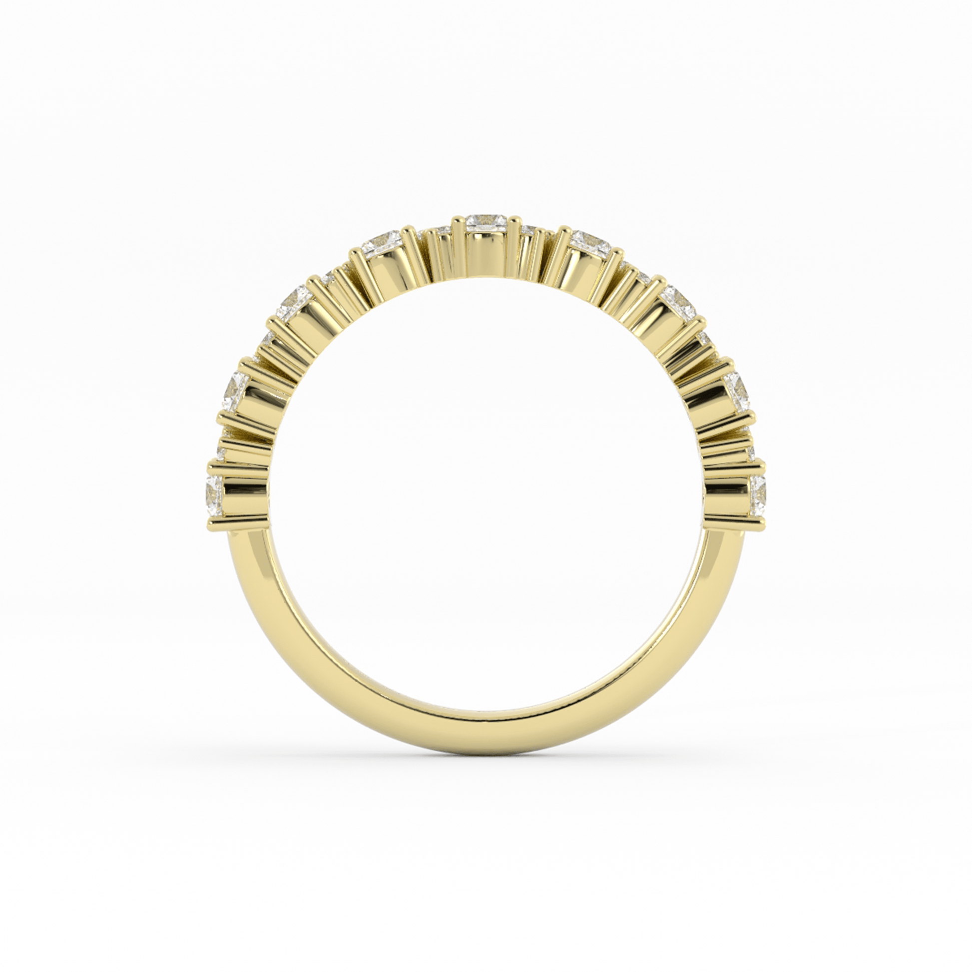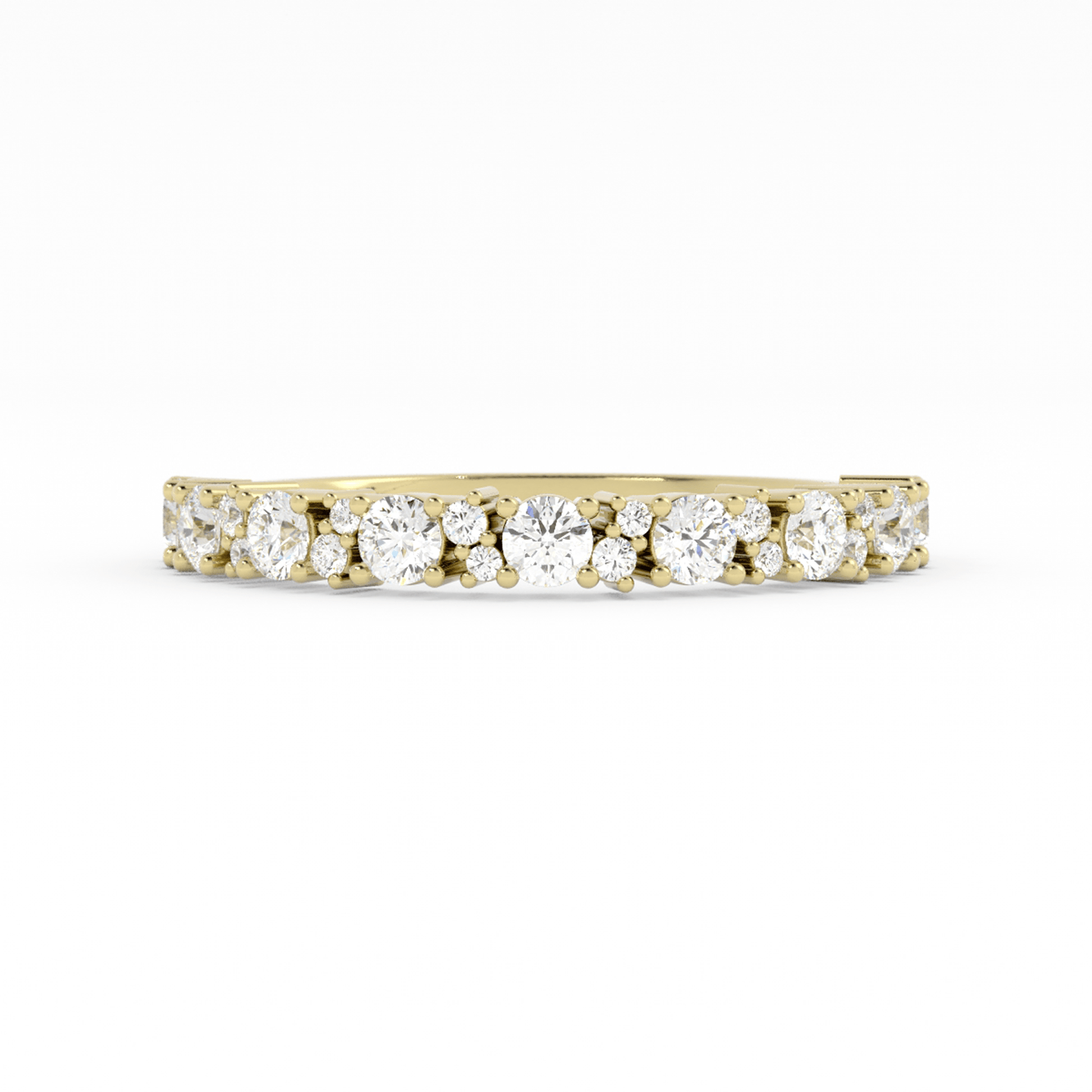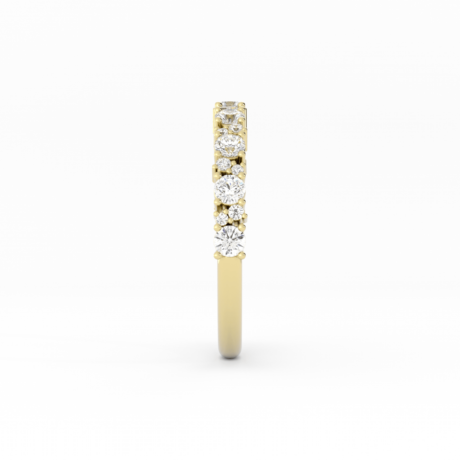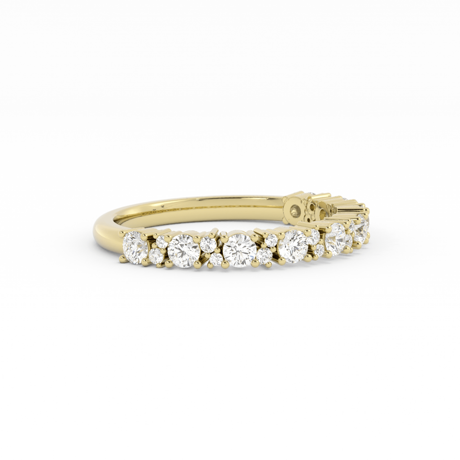 Lighthearted with a refined touch, this sparkling band features clusters of round stones in three graduating sizes, creating a soft, bubbly rhythm across the shank. The subtle contrast in scale adds texture and brilliance, making it a joyful choice for stacking or wearing solo with effortless charm.