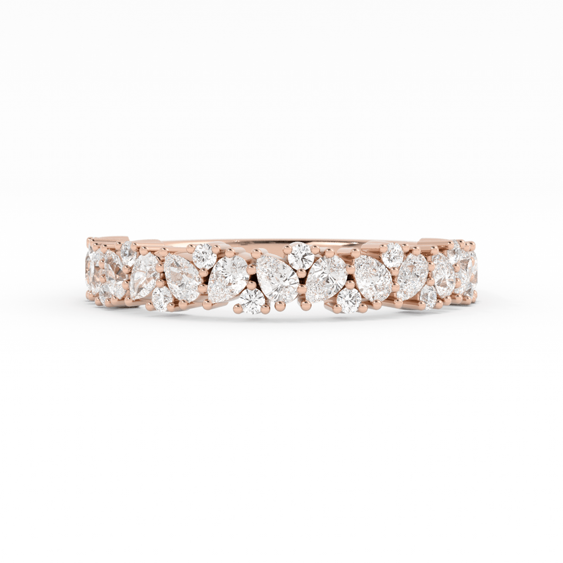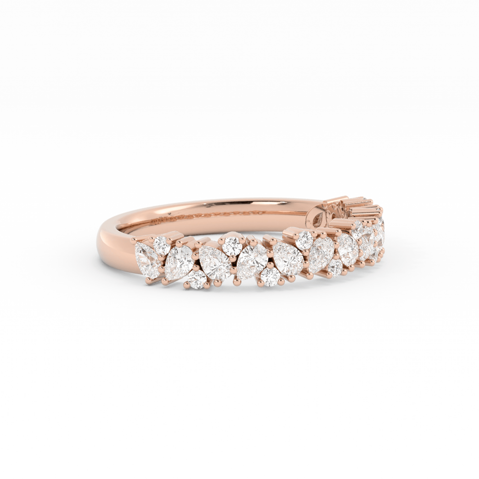 Whimsical yet refined, this delicate cluster ring features pear-cut stones set at a gentle tilt, each one alternating in direction to create a flowing, petal-like silhouette. Between them, round stones are carefully placed to bring sparkle and softness, creating a design that feels both romantic and sculptural. A modern heirloom in the making.